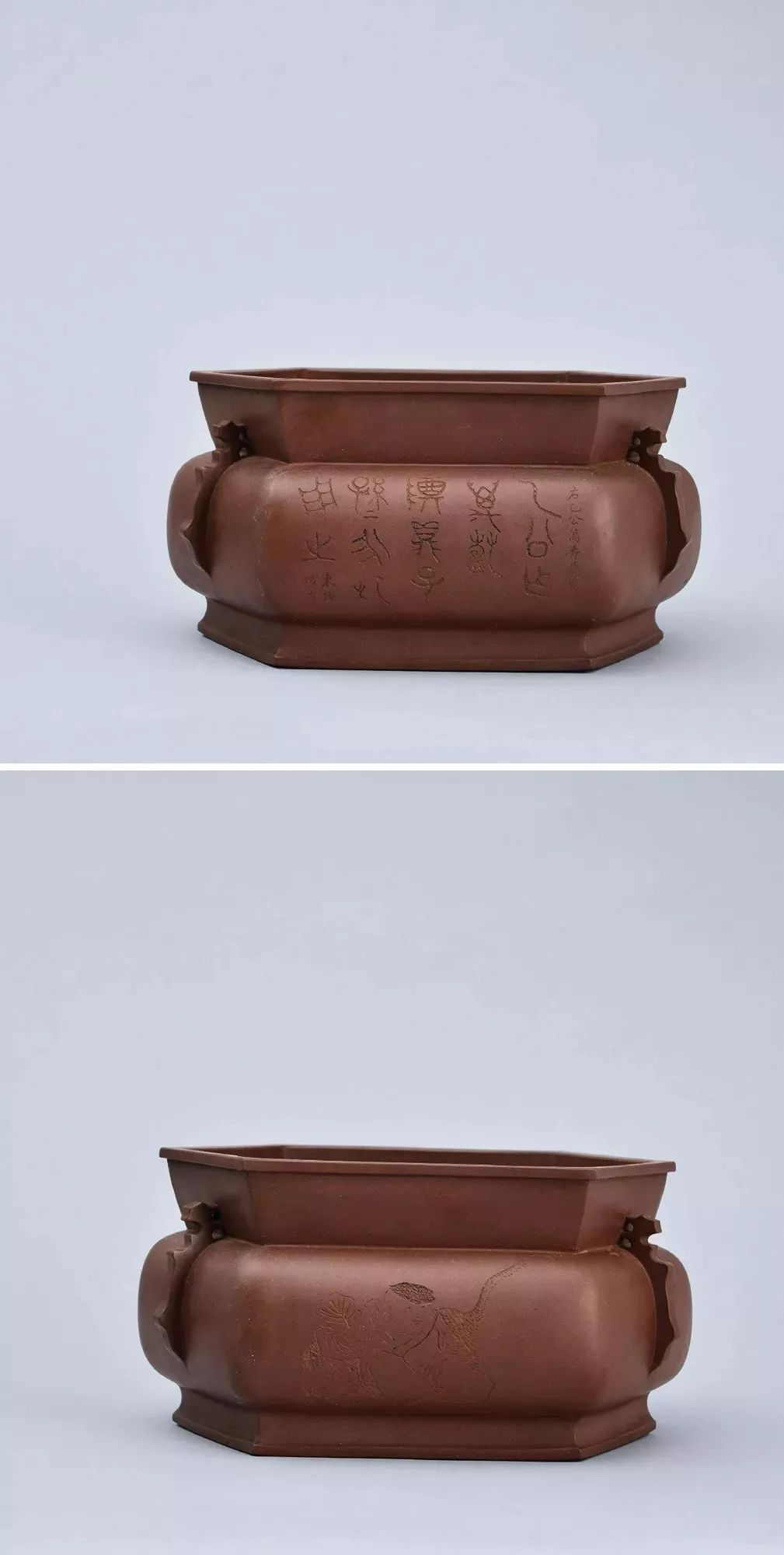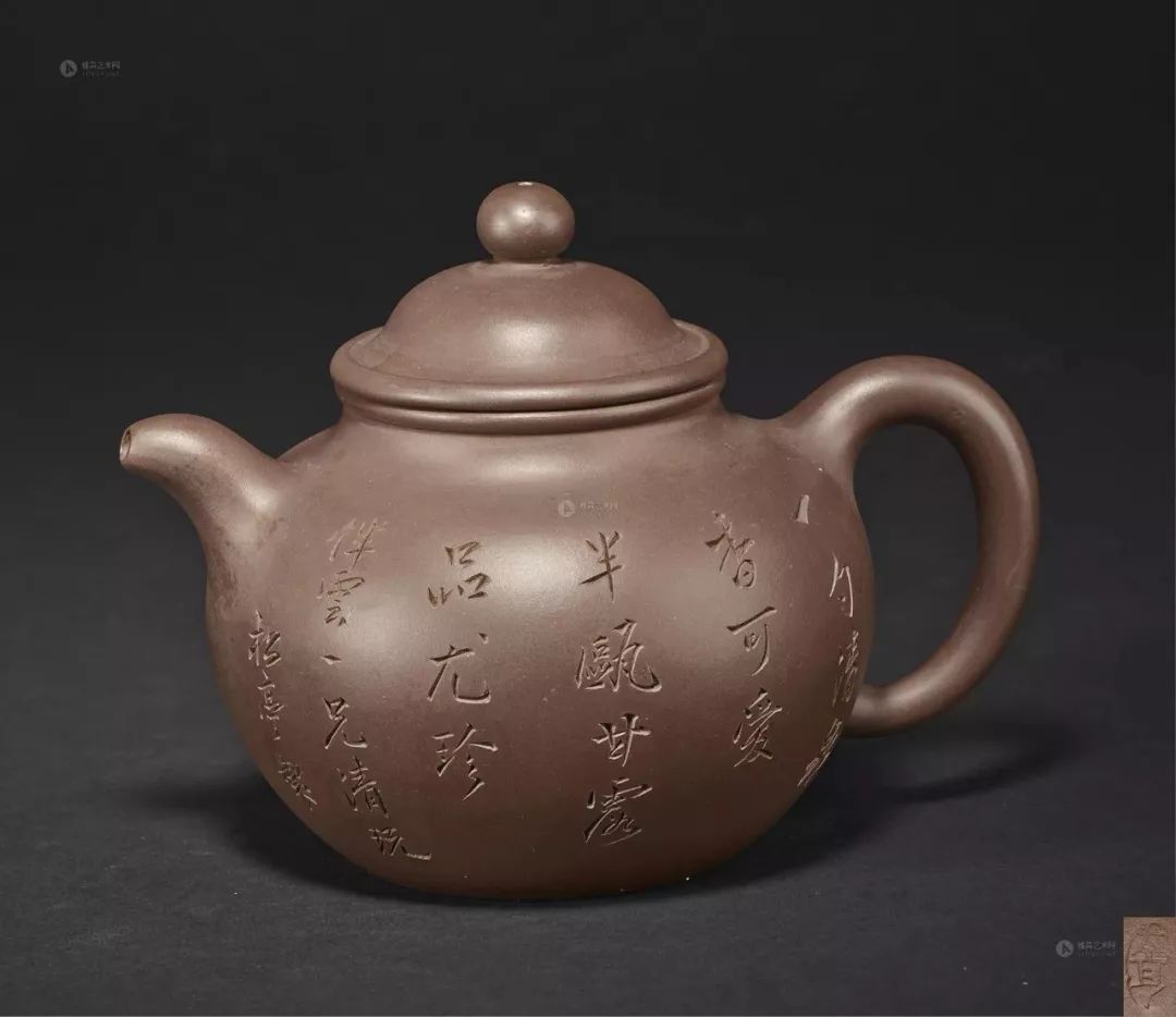 他的刻陶工艺,无论是文化品位的内涵性,还是刻制水平的精妙程度上,无不透视出诗情画意般的艺术神韵。他与其同时代著名收藏、鉴赏家吴大徵先生相交深厚,过往甚密,常聚一起研讨壶艺,并共同合作过不少紫砂精品,他就是清代制壶名家赵松亭。