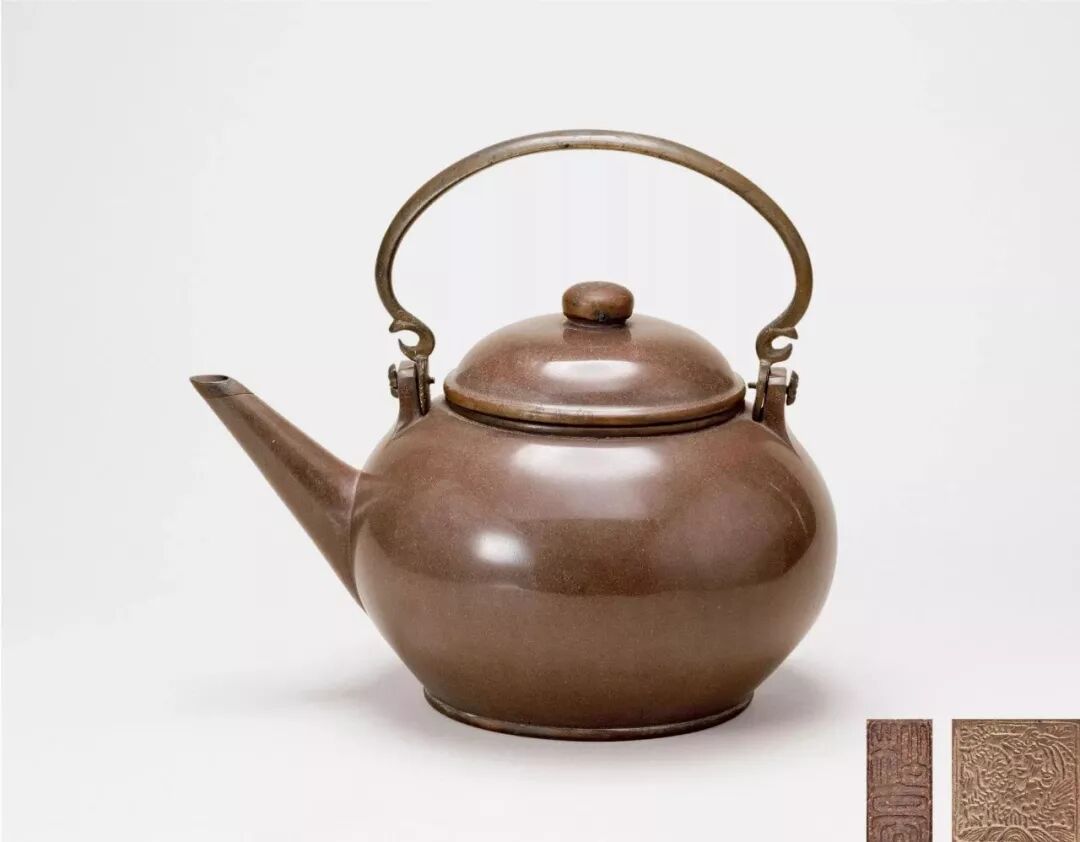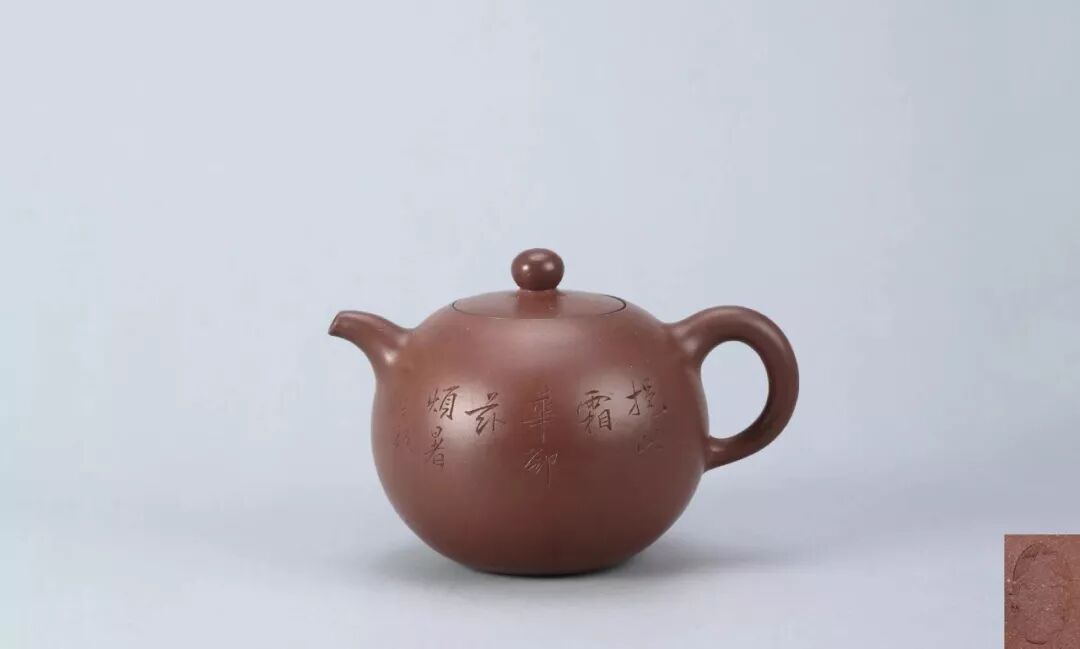 器型比例协调,结构严谨,凸显其技艺精湛。球腹,矮颈,短流,把如肥耳,流把匀称自然,口盖留唇而紧缝,盖上设小球钮。