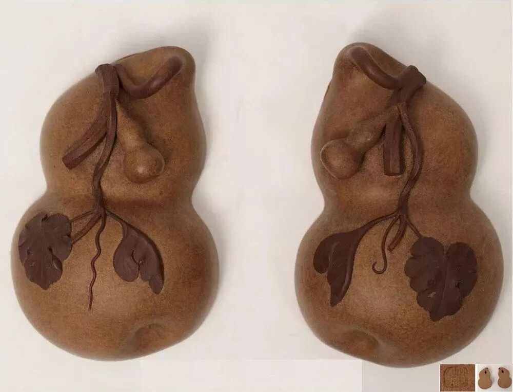 葫芦上腹部贴藤叶三枝,结有一小葫芦,其中一枝藤蔓扭曲延展,须蔓卷曲,梢叶茂盛,整器具有较强的写实效果和装饰特色,成对出现相映成趣。