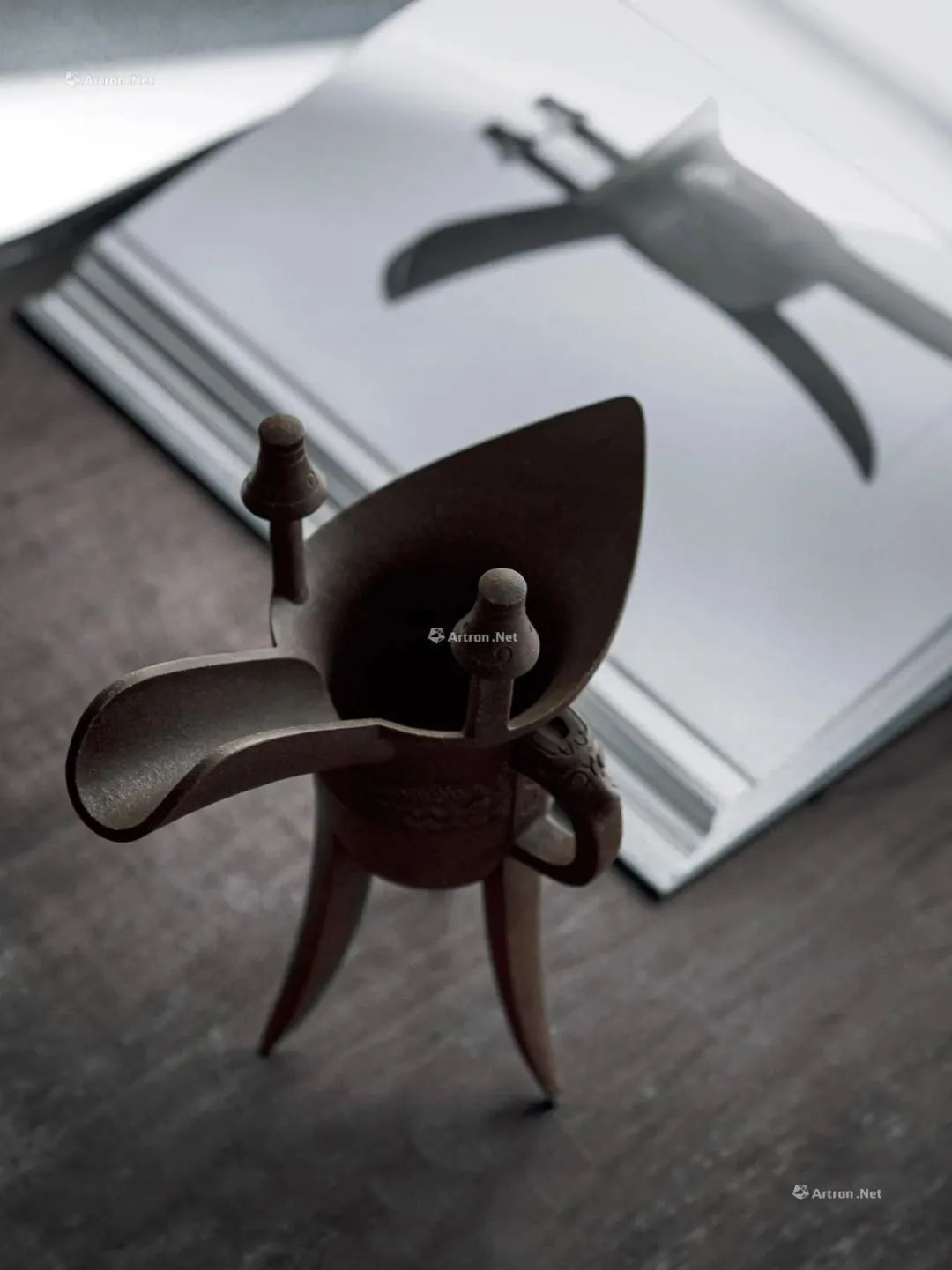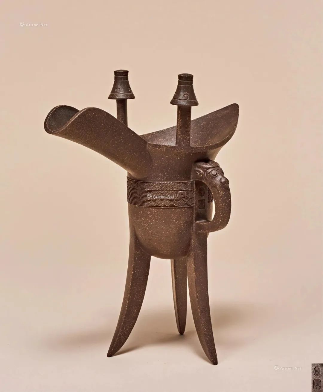 其造形仿青铜爵,圆底鼓腹,附三锥形足,带把流两侧饰柱。器腹刻带状回纹一周,把端刻兽面纹。造型挺拔古朴,纹饰精美细致。带有“陈”“鸣远”两印,作天圆地方式排列,整齐有序。