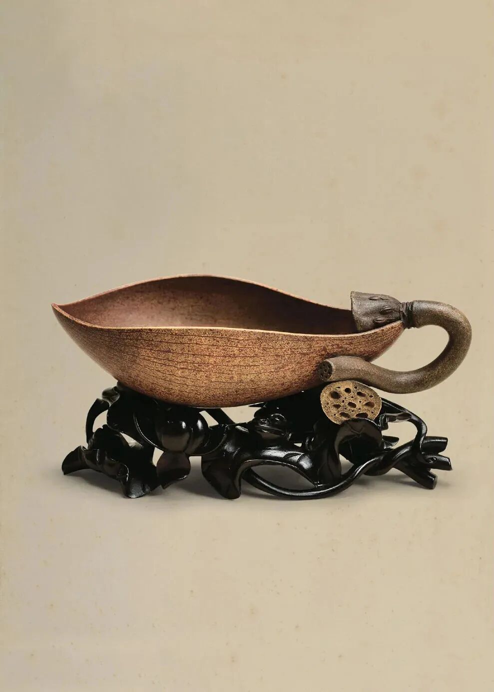 这件陈鸣远制荷叶形洗造型取自荷叶的形状,阔口,腹部饱满,通体为紫褐色,远远看去就像一片迎风舒展的荷叶,筋脉清晰可见,彰显一派盎然生机。让人有风送荷香扑鼻来之感,品茗把玩令人心醉。