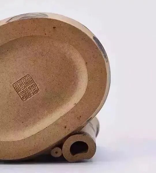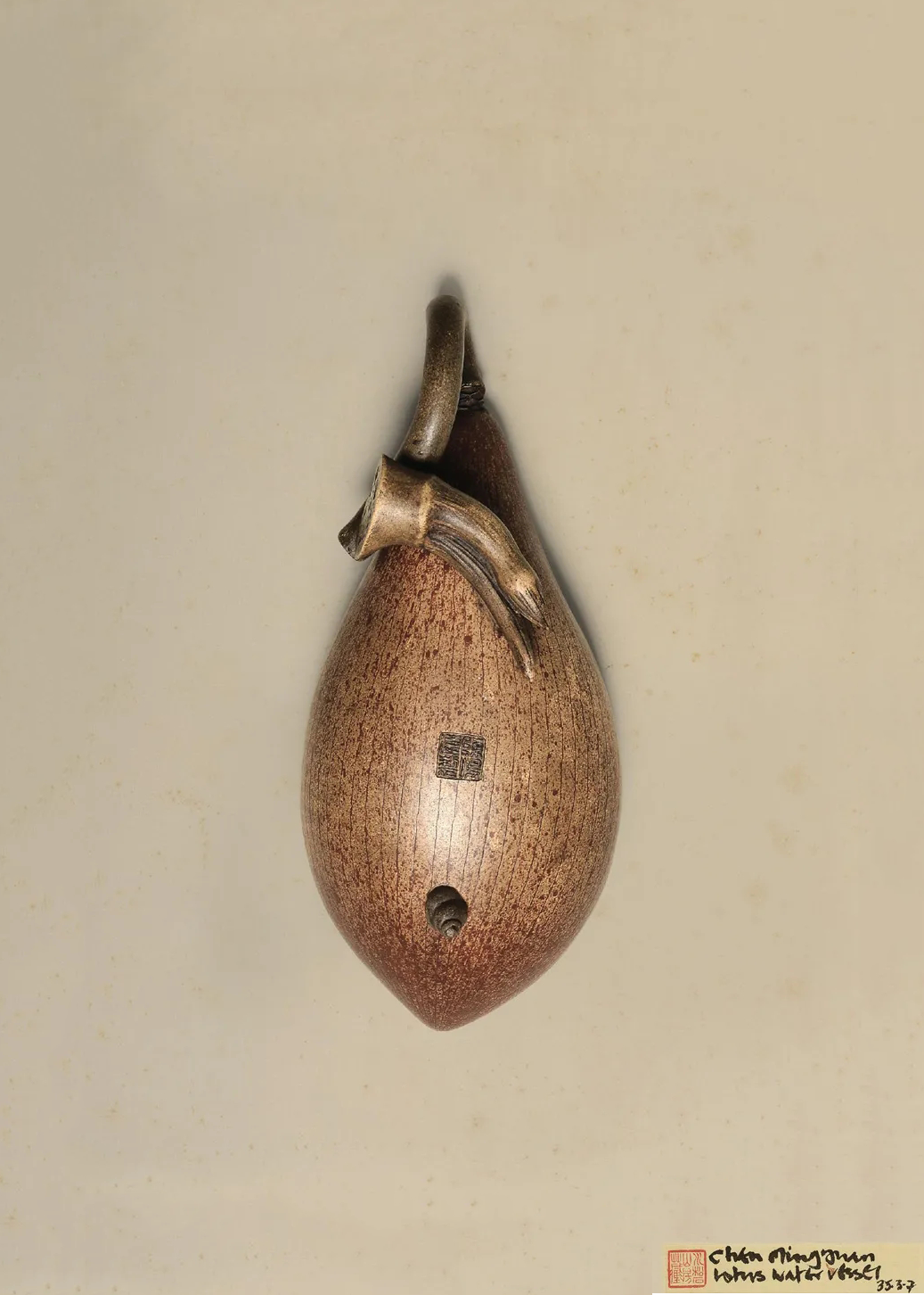 这件陈鸣远制葫芦形水盂,朱砂胎,胎身色泽黄赭温润,烧结后器表润亮,入手微沉,底部留有泥片接缝痕迹,整体泥胎气氛为典型清代早期风格。