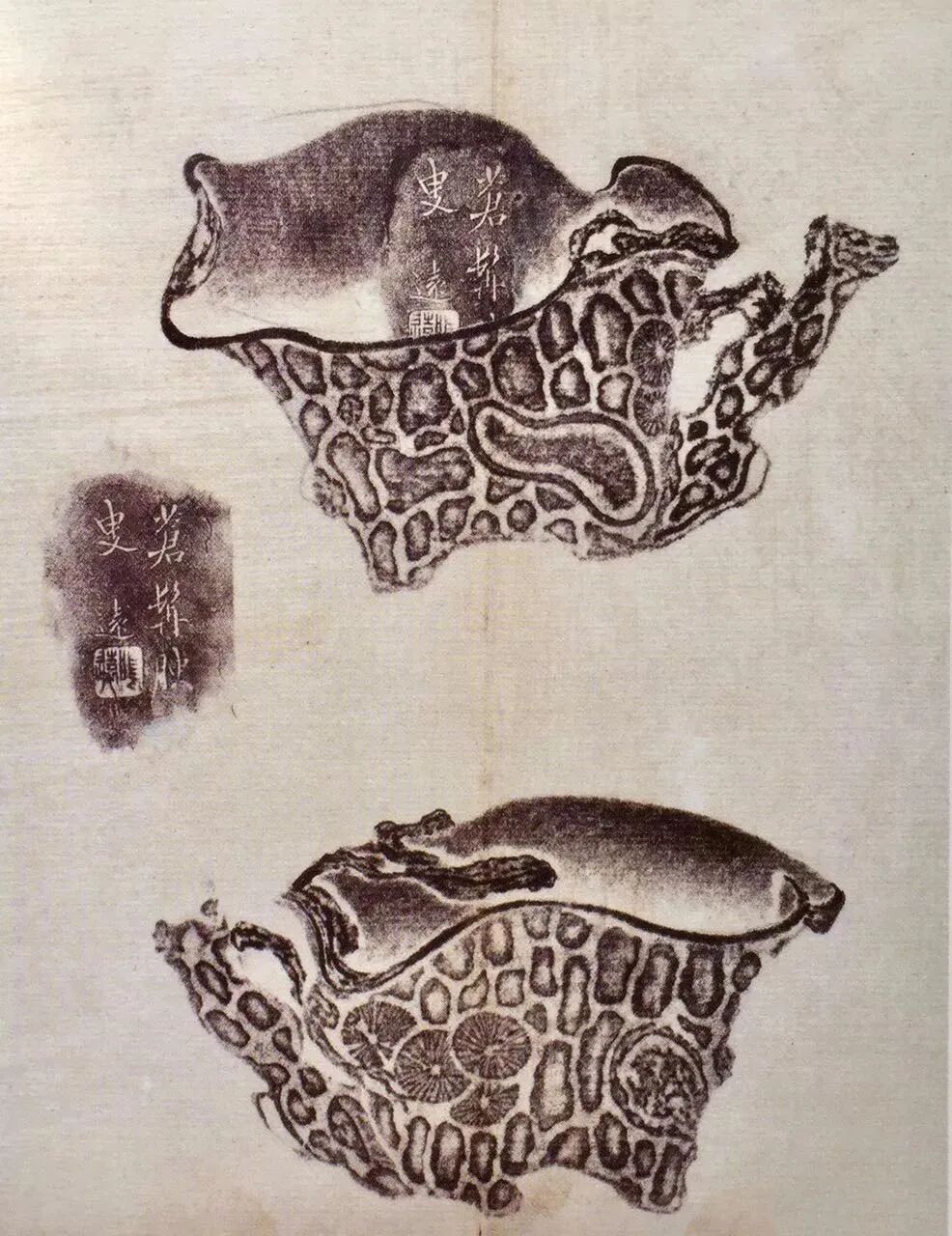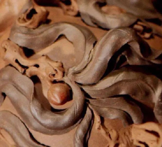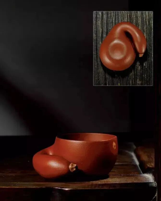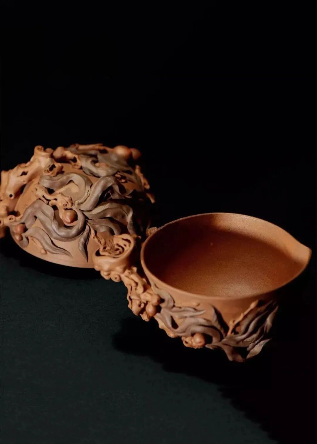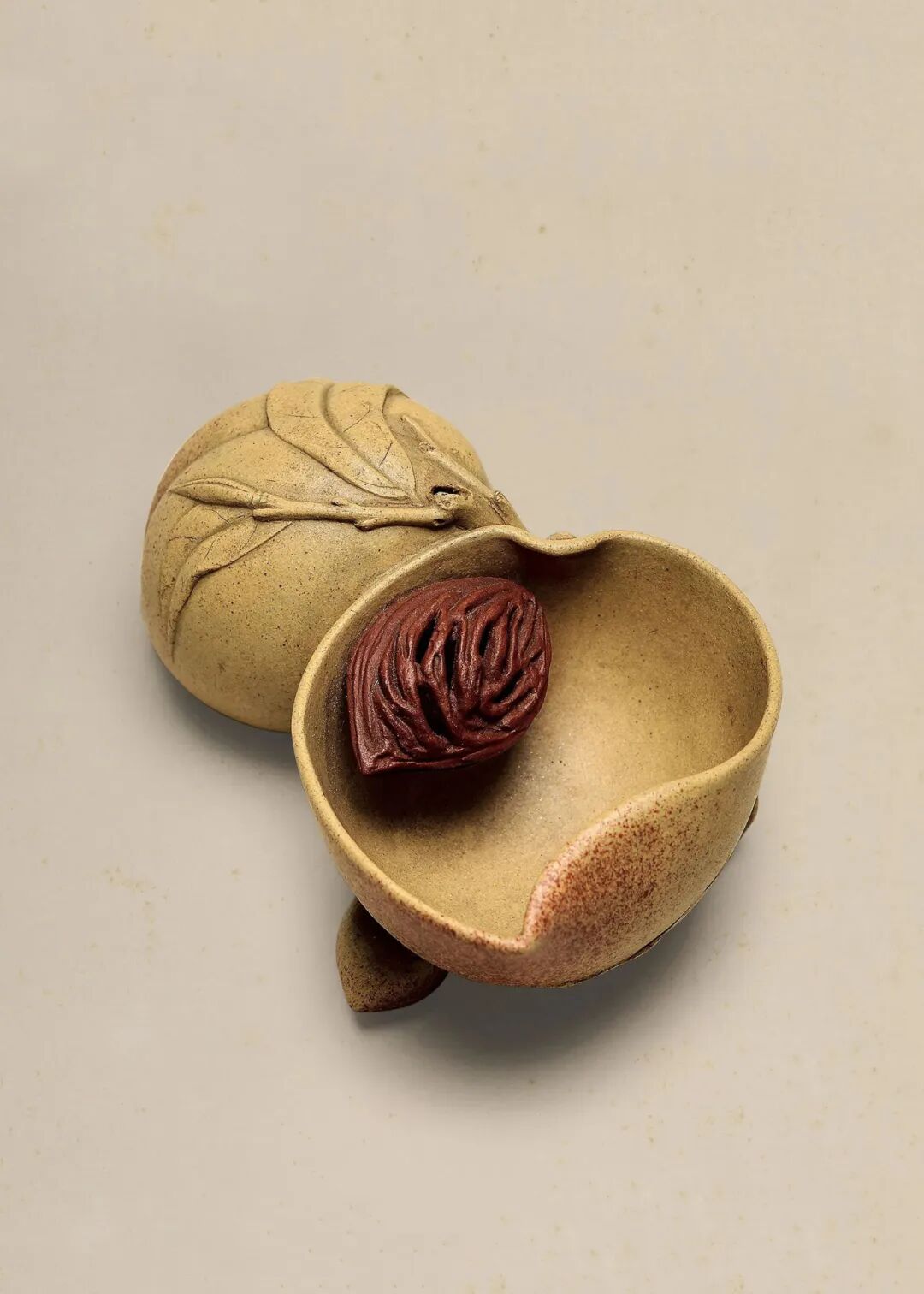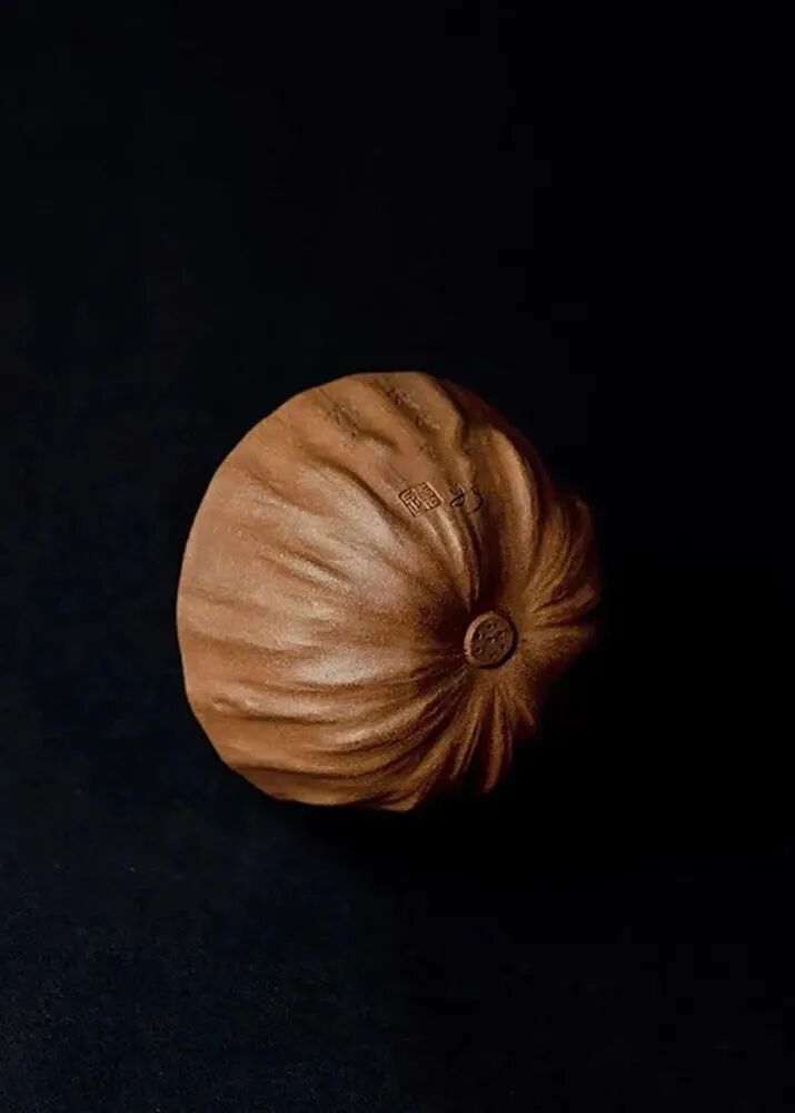 此件鸣远款的段泥莲蓬杯型制非常特别,杯体以莲蓬为体,采用象形与写意结合,外壁表皮褶皱自然写意,简约之中呈现出莲蓬之干枯之态。