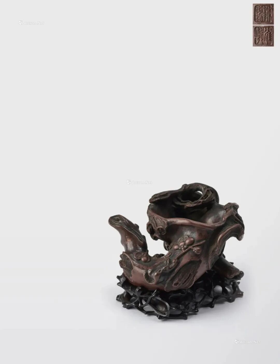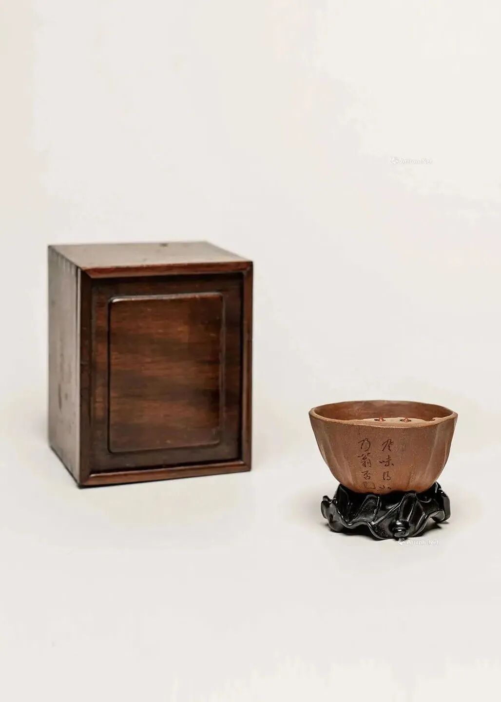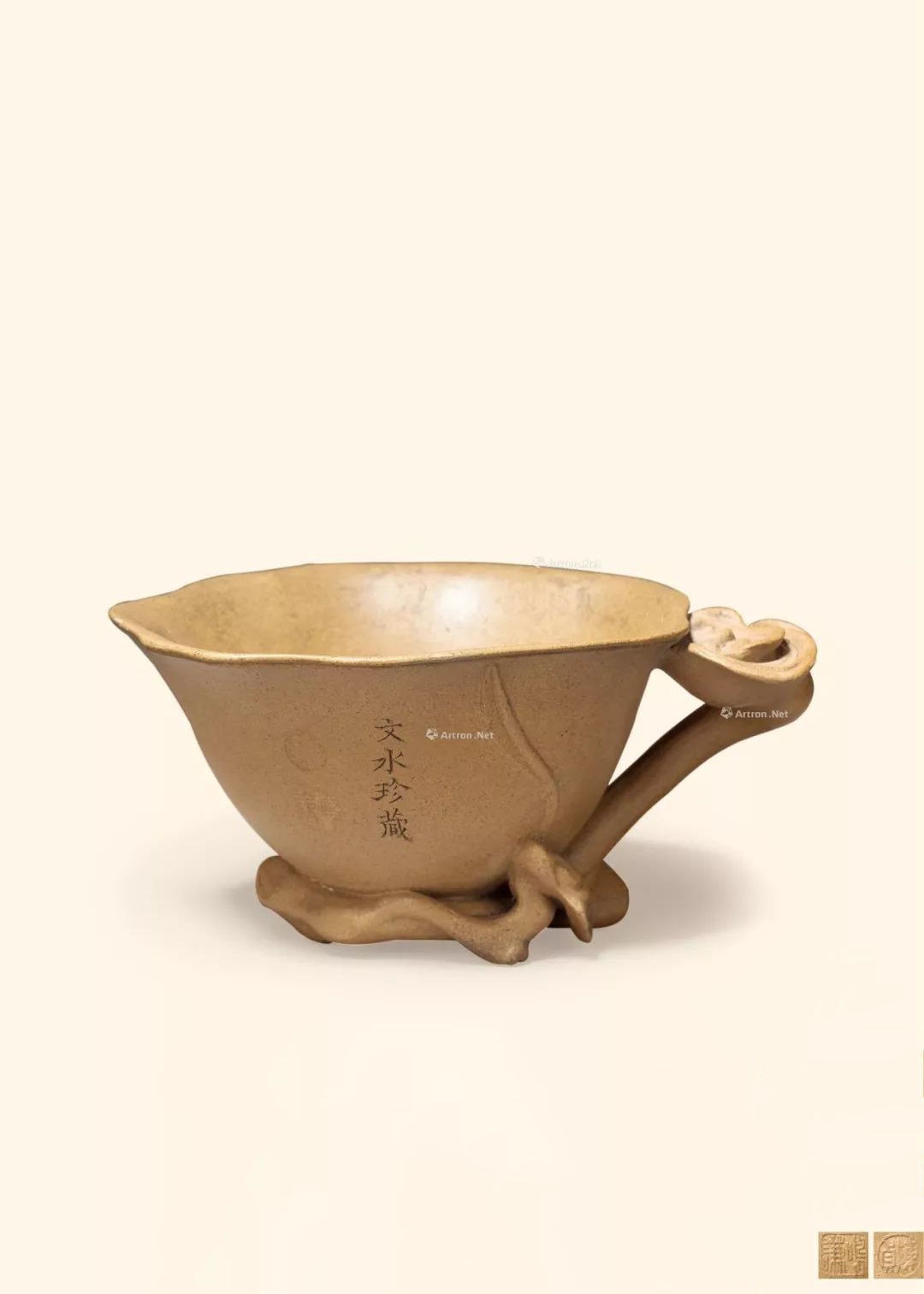 灵芝自古为仙草,是祥瑞的象征,灵芝杯寓意长寿福禄、吉祥如意。钤印:鸣远、陈贞(杯身款),铭文:文水珍藏