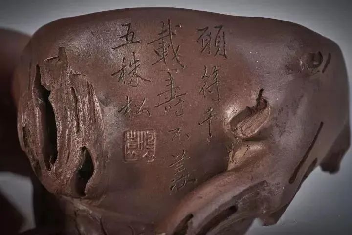 几蓬松针挂于杯柄两侧新枝,俨然老干新枝的气象。整个松桩苍劲有力,寓意永生不衰。杯身一侧留白处题“愿符千载寿,不羡五株松”。