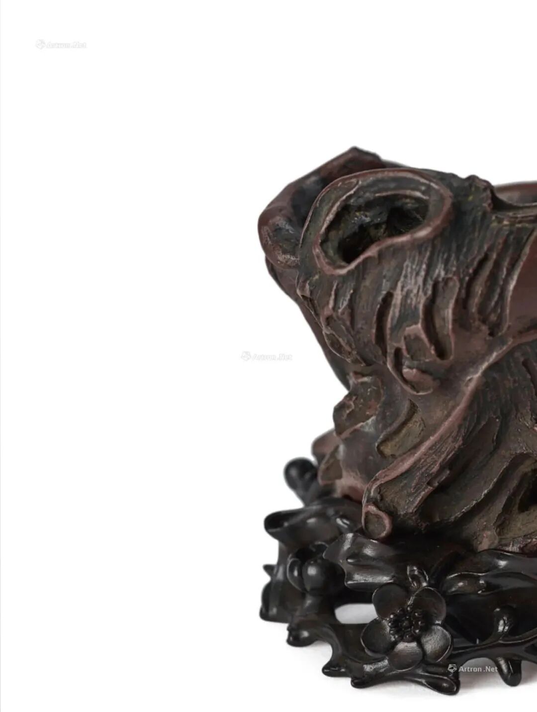 底部吟有“陈鸣远制”印章,带有刻有莲蓬与莲枝随形木座,枝叶穿插错落,雕刻细腻精致,与器物相得益彰。此件水盂实用性与观赏陈设性并重供置于书斋的案几之上,与砚田相伴充满文人雅趣。做到了造型、装饰和泥质的完美结合,是一件不可多得的案头雅玩。