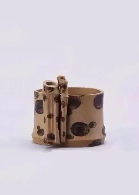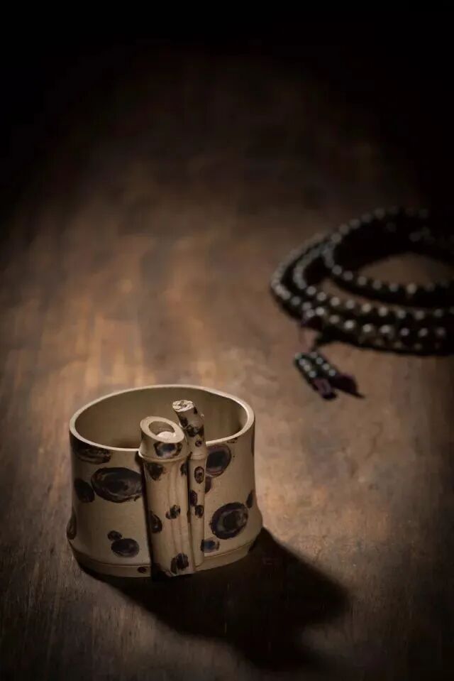竹节杯,仿湘妃竹,此杯介于光素器与花货之间,风格为仿生手法。斑竹竹节杯的构思别出心裁,杯身取一截竹段为主体,呈扁圆随形状,造型素净,气韵生动,杯身外侧以紫褐色脂泥描绘色斑,运笔流畅自如,写实逼真。