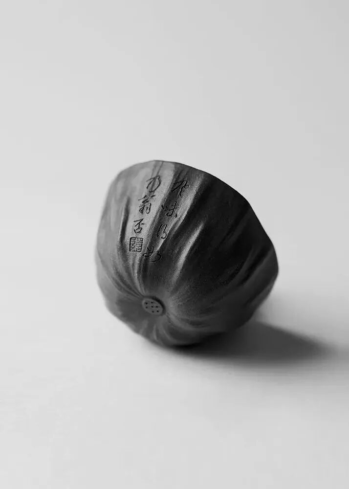 杯体内壁则采用对比的手法,一侧光滑,一侧则以莲蓬之态,干枯破损之貌呈现,并塑两颗莲子置于莲蓬之上。