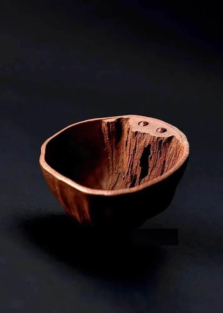 此杯为松树桩形的像生紫砂器,松枝为柄,杯口自然随形,自然伸展的枝干为足,树皮肌理逼真。