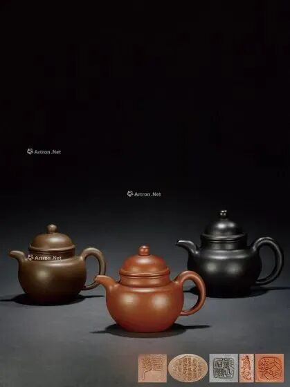 清末民国·程(陈)寿珍制冰心道人款紫泥掇球壶 (一组三件)