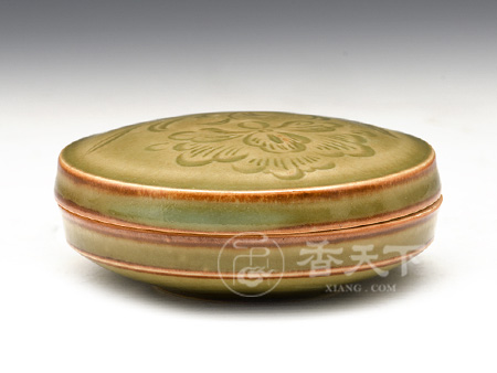 “缠枝莲”刻花香盒 龙窑柴烧梅子青釉