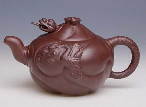 典型传统壶型,是鱼跃龙门之意.民国的唐树芷所制小鱼化龙壶钮为卷云状,壶身浅塑波浪,波浪中龙伸出首部,龙尾卷成壶把,把上鳞片刻划清晰.此壶红泥制成,形体较小,做工精细.清代邵大享鱼化龙为波浪堆塑得一层一层,立体感强,而波涛中龙露出头部而不见爪,钮为堆浪状,装在盖里的龙头短而粗。