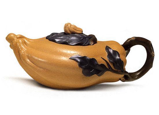 另一种关于佛手壶创意来源于一种叫五指橘的水果,其形状如同五个手指握在一起,是一种仿生器造型,瓜蒂与叶巧妙连接,巧妙表现出紫砂的含蓄自然。