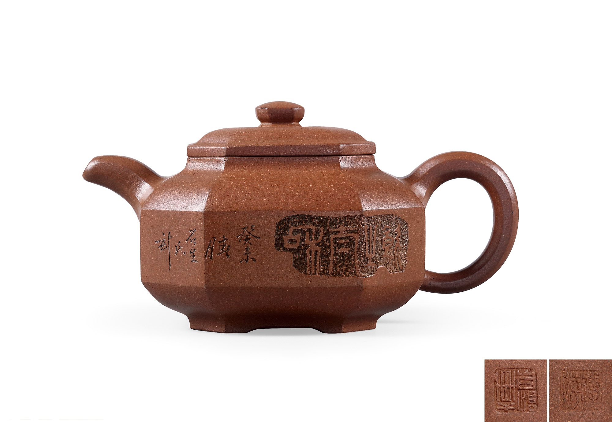 形制密码: 造型简洁、稳重、含蓄,极具几何美感和现代感。 器型设计服务于书画铭刻的布局,壶面成为文人诗书画印的载体。形制与铭文意境高度统一(如“石铫”之形配“不肥而坚,是以永年”之铭),完美体现了文人的哲学思考、审美情趣与生活雅趣。