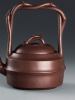 他身材魁梧、生性耿直,制壶风格却温厚稳重,尤擅以竹入壶,自成一派。《紫大竹提梁壶》泥色近竹,竹节、竹叶纹理逼真,尽显竹子的风骨气节;《绞竹提梁壶》创新绞泥工艺,双色泥料运用精湛,拍出402.5万元天价。