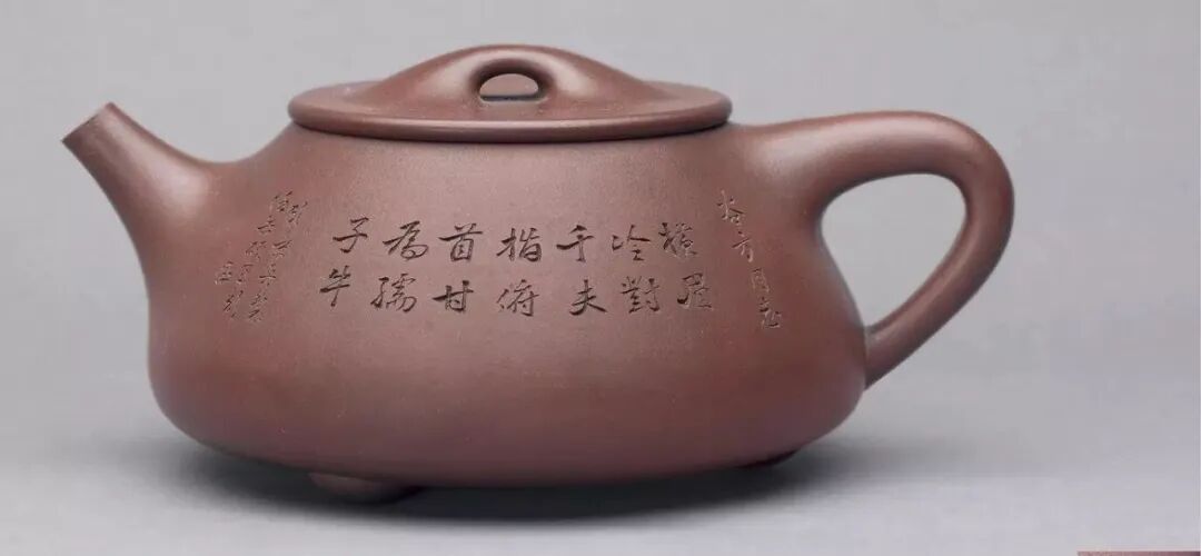他的“单刀侧入”刻法刀锋灵秀,文字与壶型浑然一体,顾景舟的《大石瓢壶》配上他的刻字,成就“壶刻双绝”的传世经典。