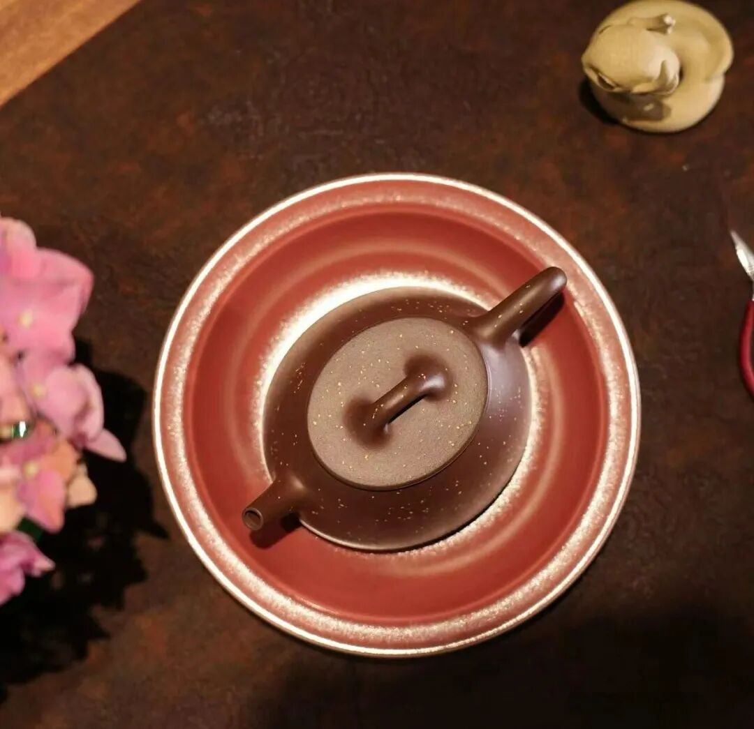 而他创作的倒把西施壶,以饱满丰盈的造型成为紫砂经典,后世模仿者众多,却始终难以企及原作的气韵与力度。他的朱泥小壶更是精巧绝伦,胚体薄而圆,出水平稳爽利,备受藏家追捧。