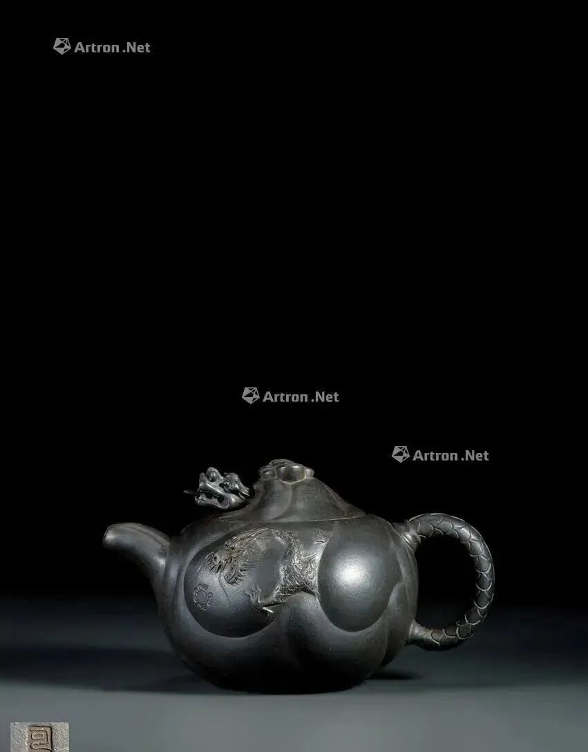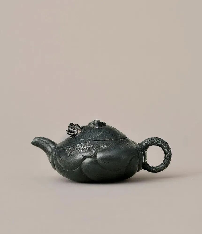 近代 朱可心制鱼化龙墨绿泥壶