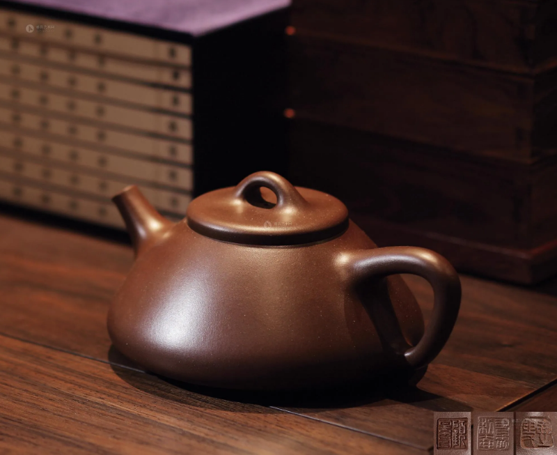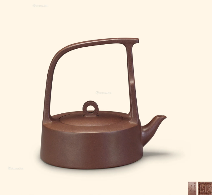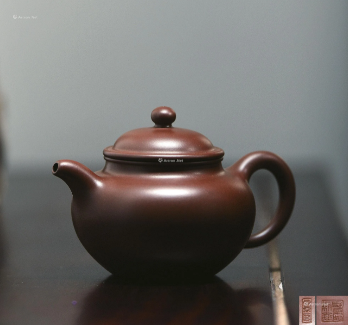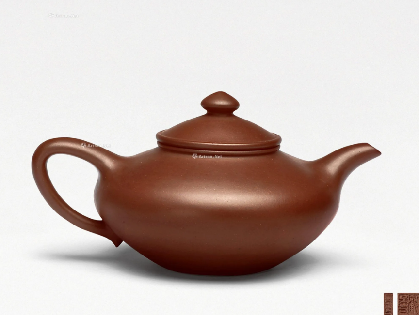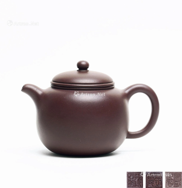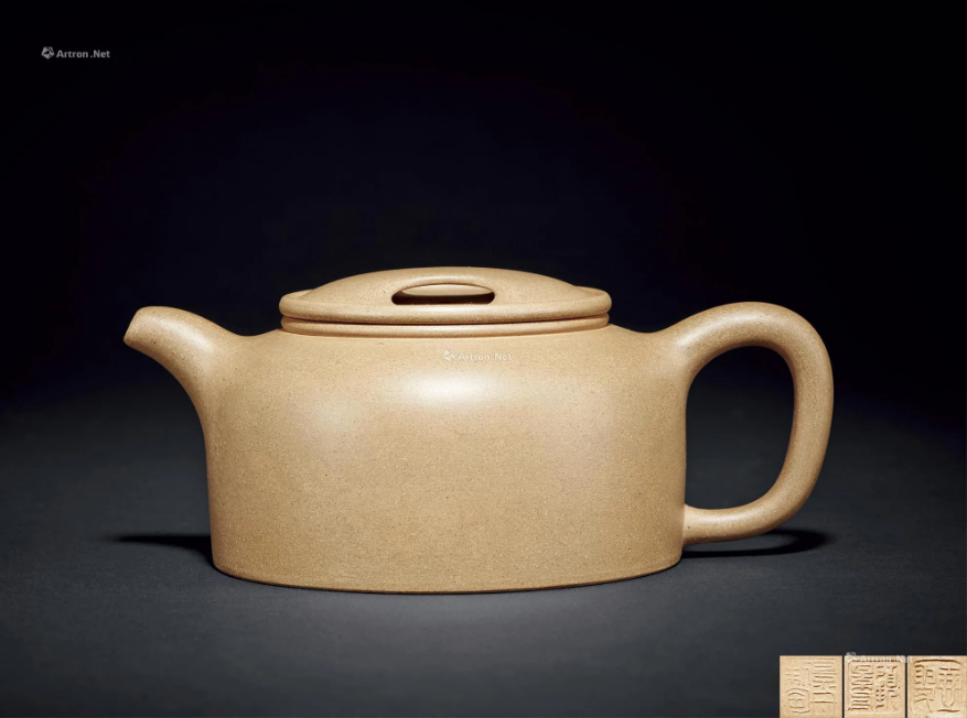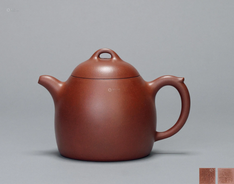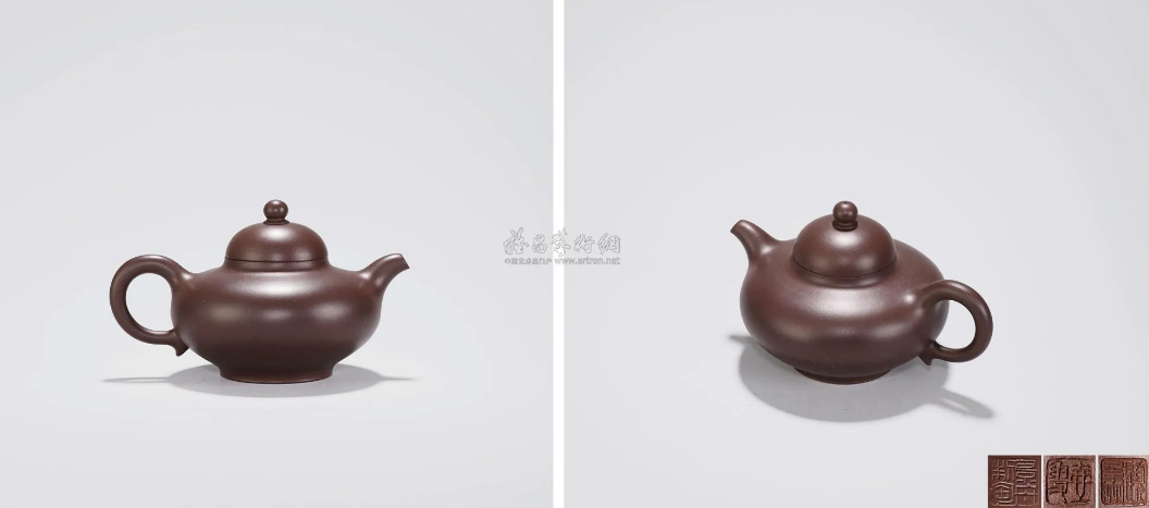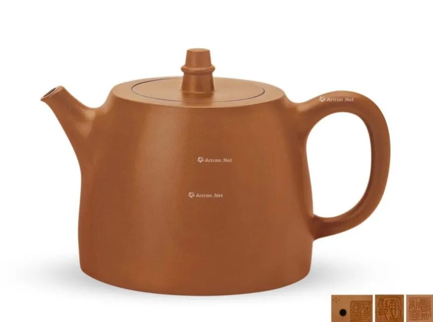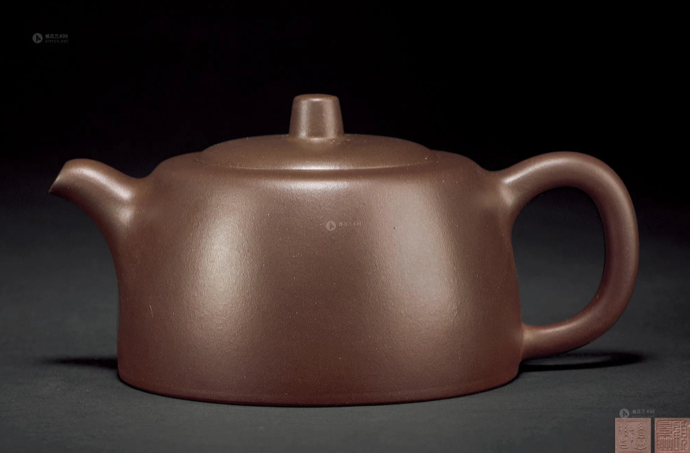 此壶形似秤砣,造型最为简洁,无有腰线、肩线、颈线等其他工艺处理,通体完全靠平而不凹的圈足大底和光洁温润的块面,平正的截盖、流畅的整体线条来诠释整个主题。