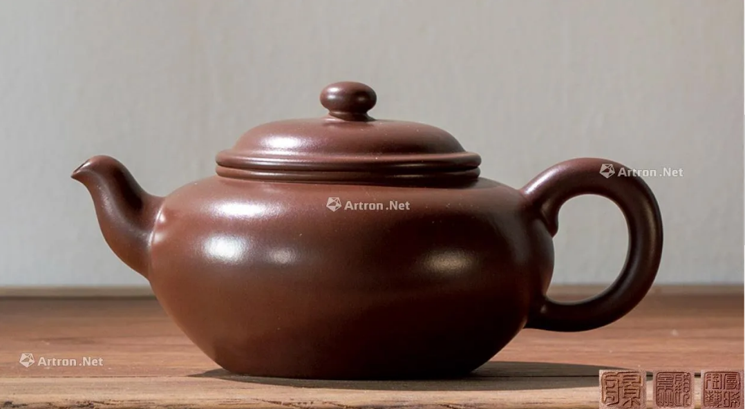 此件拍品直腹圈足、阔口出唇、短弯流、耳廓把。压盖式,盖面作拱桥状,犹如牛鼻,故取名『牛盖莲子壶』。此壶式为七老之一—裴石民先生于上世纪六十年代创作,遂成为砂壶款式中的经典之作。
