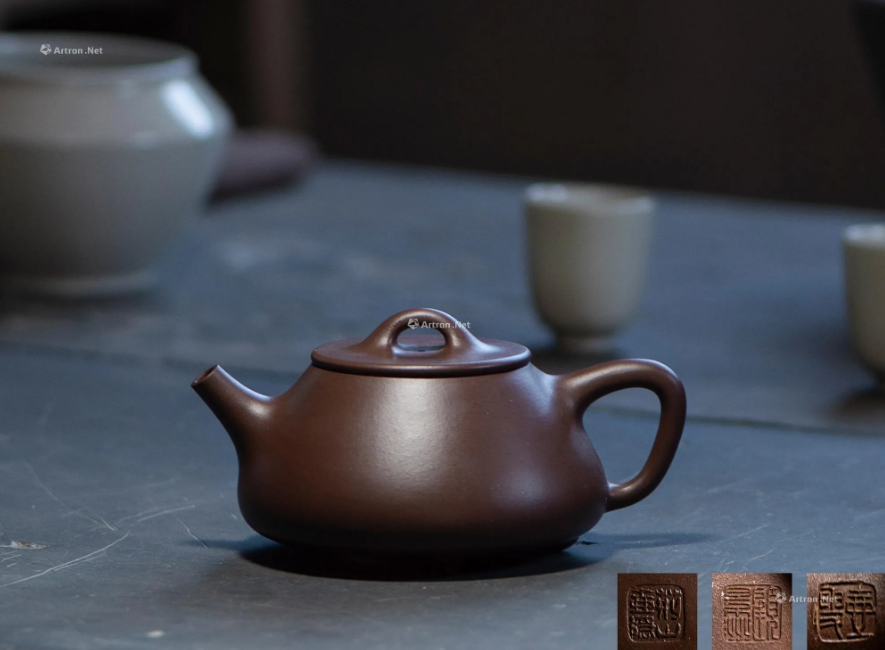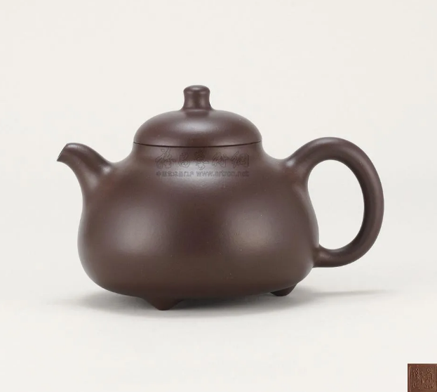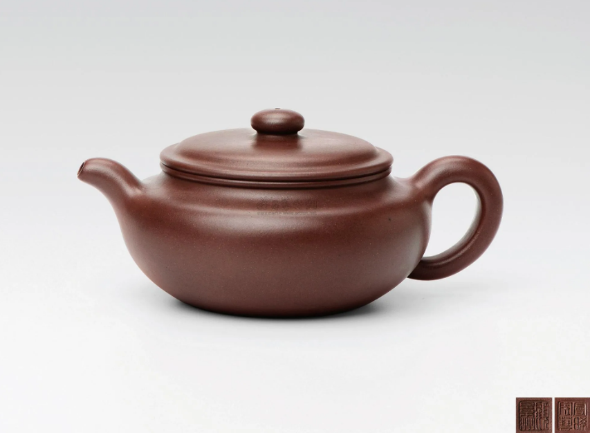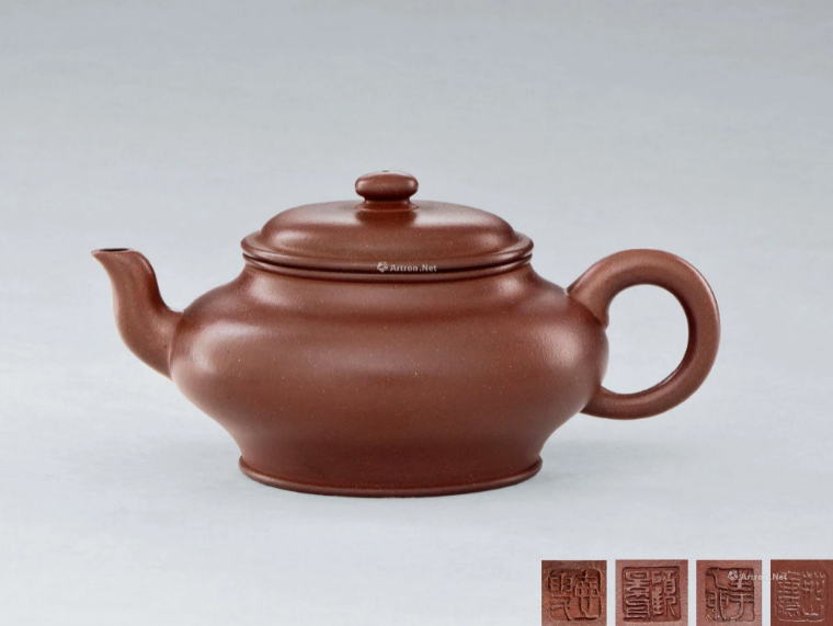 此壶微扁圆折腹隆肩,形体雄健线条流畅,特显丰满柔和之美。与我们常见的笑樱壶高身造型相对,而称之为扁缨(樱)壶。