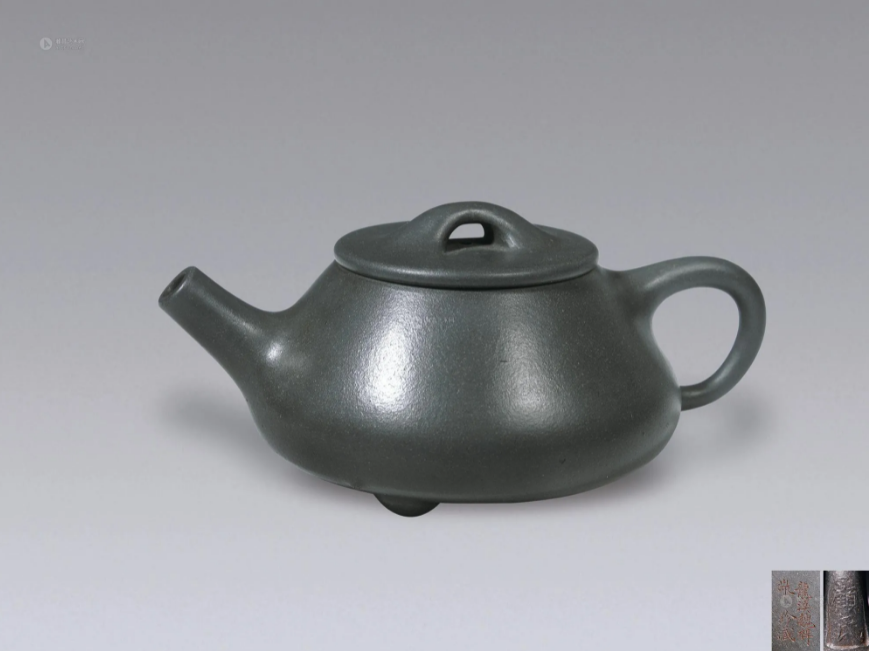 此品相当难得少见,全器以绿泥制作。以”曼生石瓢”为本,在细节上少许变动,融入了典型的”顾氏美学“,使之在隽秀之中又增添了几许刚健之气。全器以硬朗直流最是明显。做为侍茶出水流畅的表现,横直后弯的细把方便好握,平盖桥纽精致有韵,圆三足鼎立全壶,盖内墙未端并修饰倒角一圈,此为顾景舟大师特有手法。整体造型别致有神韵,秀丽典雅,线条舒适流畅,比率恰到好处,处处可见不凡之功力表现。