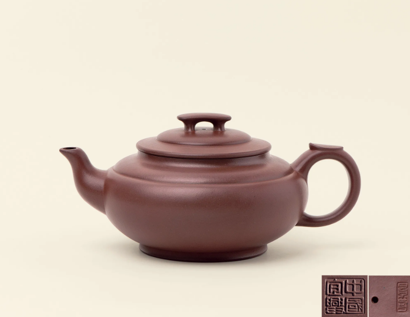 此壶造型光素简洁,古意盎然,具备典型的民末风格,传统而不失时代气息,这与顾景舟先生师古不泥,把创新融于传统的一贯坚持密不可分。盖内钤阳文篆书“顾景舟”方印,壶底阳文篆书“荆南山樵”方印,为顾老早期作品,保存至今,仍能完好如初,极为可贵。“荆南山樵”,为顾景洲与沪上书画家交往后所用艺名印款。