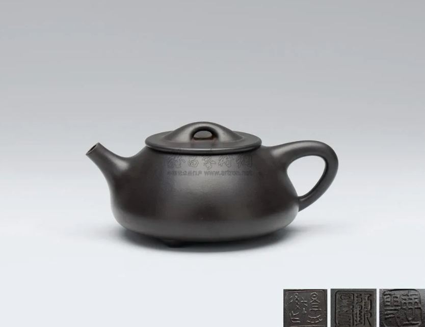 此壶由黑泥制成,泥土淘洗精细。其造型为扁圆,壶体上小下饱,斜面过渡自然。壶身、流、把、钮、足搭配恰当,线条利落明快,起承转合交代清楚。显得挺拔精神,沉静而深意隽永。
