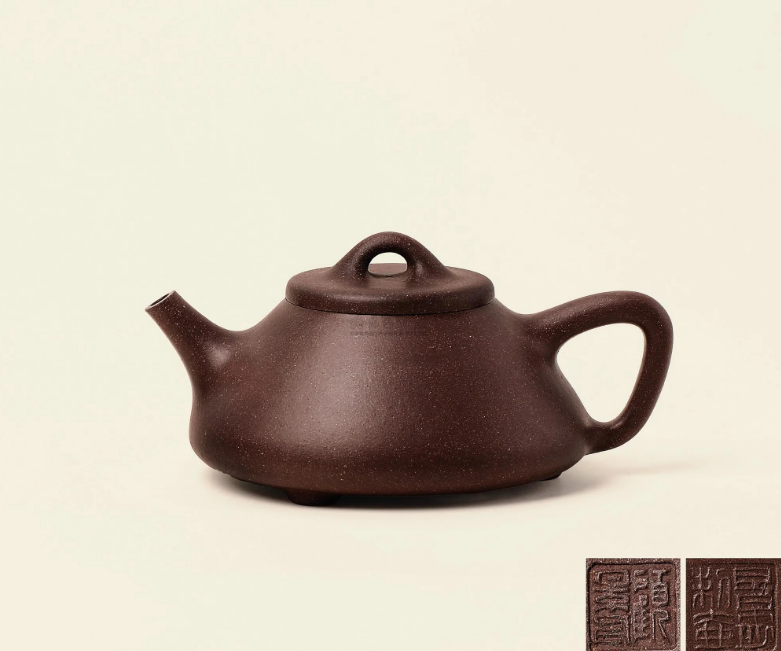 上世纪70年代后期再次制作同款壶一把,底部钤盖椭圆“景舟”款,錾梢钤印“景记”,1982年发表于《壶锦》一书。80年代后期,顾景舟放大了尺寸,将壶体的容量从60毫升增加到220毫升,第三次制作了“小石瓢壶”,盖内铃印“顾景洲”,在底部钤印“荆山壶隐”,壶身底部靠近錾梢部钤印“壶叟”。