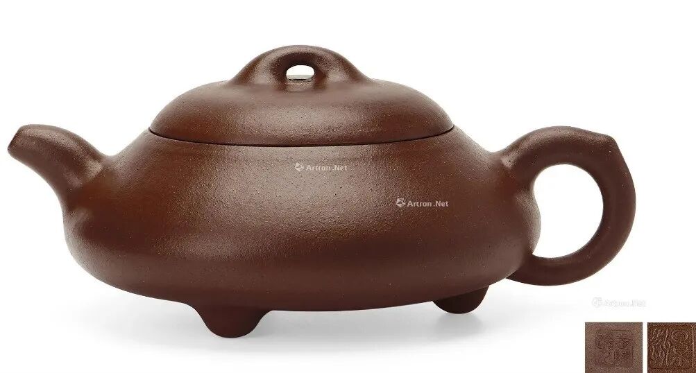 本件石瓢壶从壶式上看,壶形上小下大,重心下垂,造型沉稳,壶嘴为矮而有力的直筒形,出水畅顺,极速有力。壶身呈“金字塔”式,壶流、壶口、壶把三点形成水平直线,符合科学性,观赏端庄敦穆。