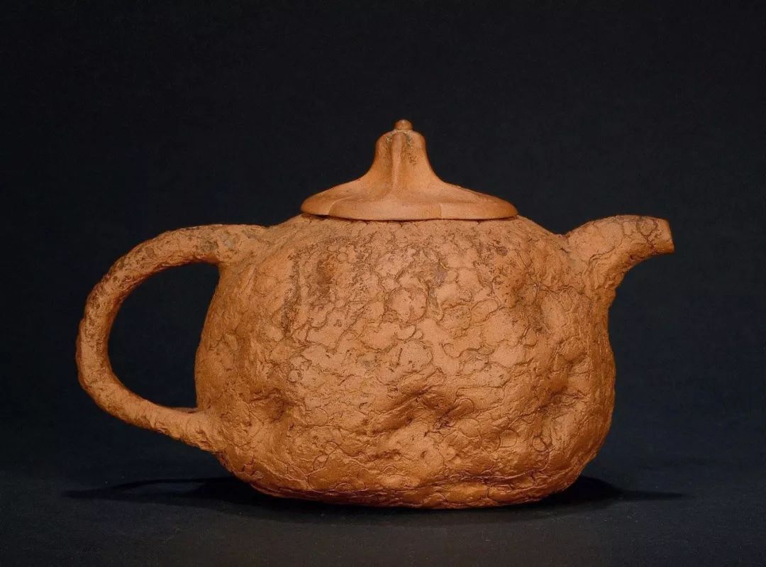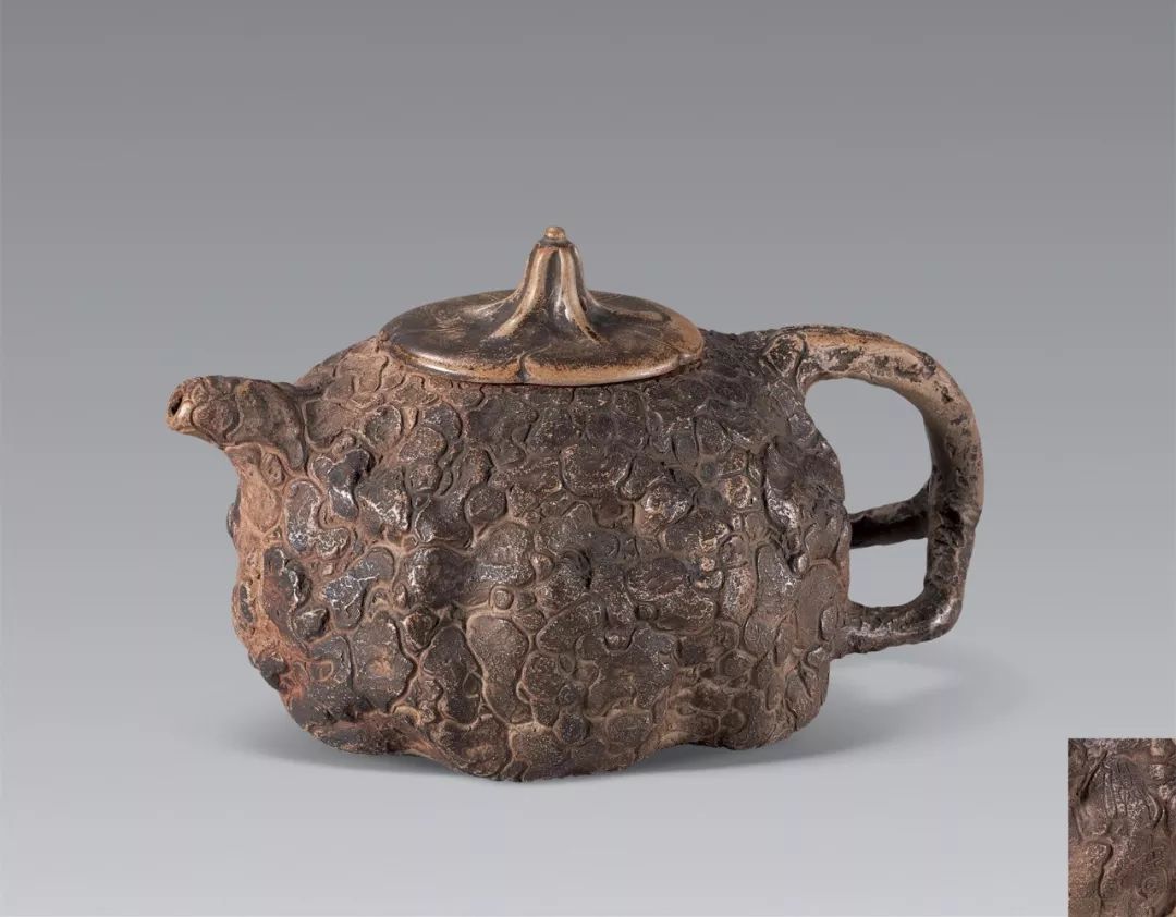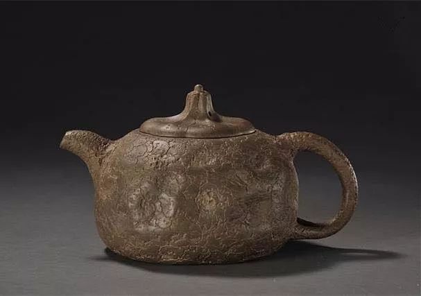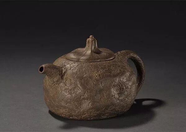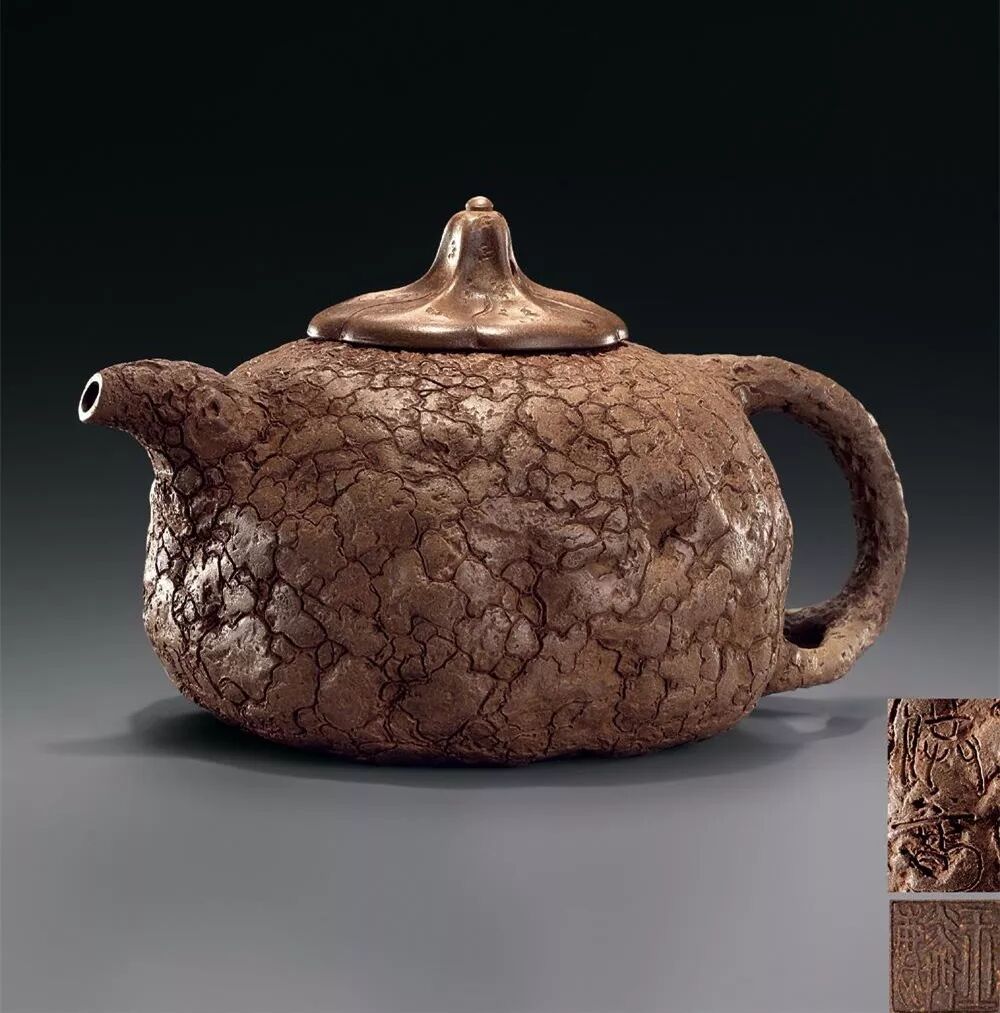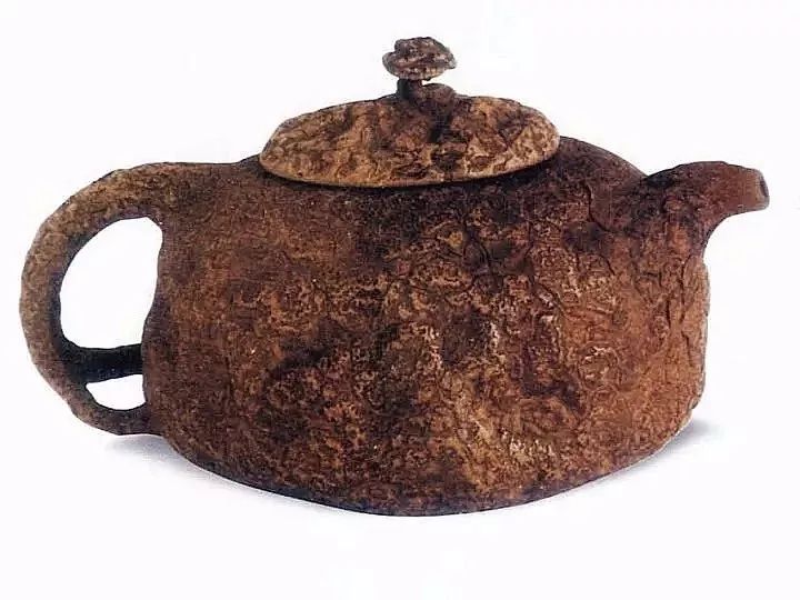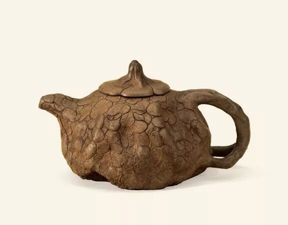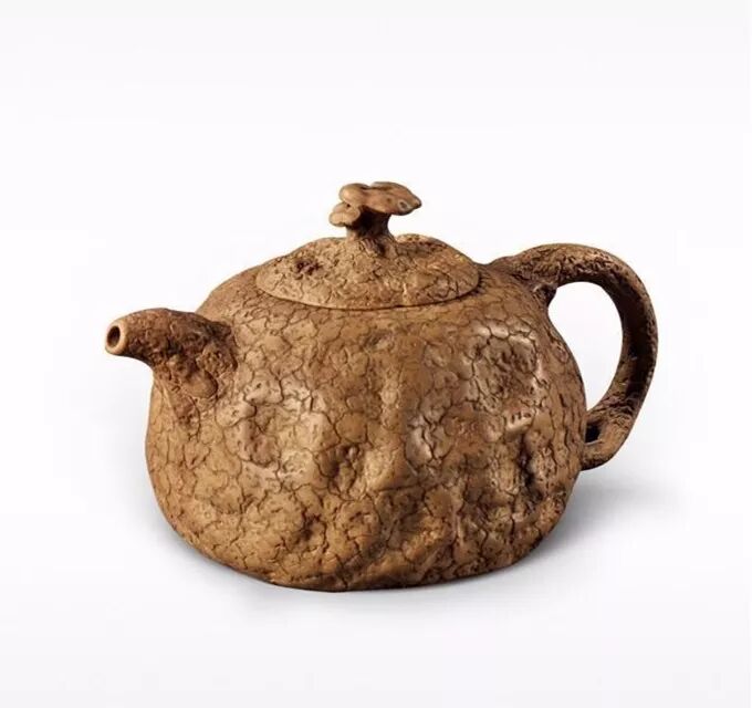 供春壶是紫砂发展史上开始有记载的第一件作品,是供春仿照金沙寺旁大银杏树的树瘿形状制作,壶表满布褶皱斑驳、缭绕的树瘿纹理,毕显华章,当时人称赞“栗色暗暗,如古今铁,敦庞周正。”