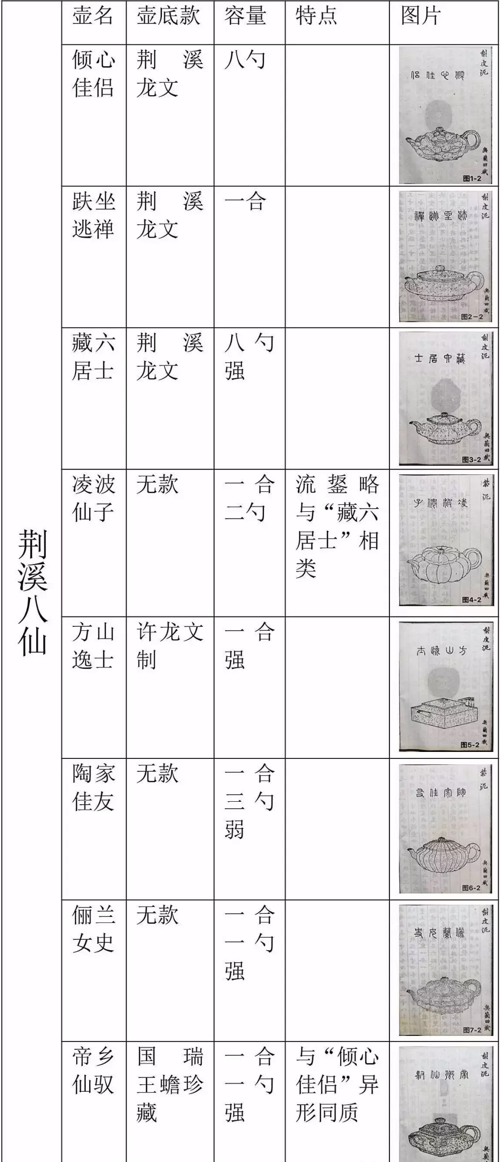 收录有明万历李仲芳壶、明末的陈和之壶、清初的陈鸣远仿古壶,还有嘉庆二十三年的梨皮泥壶和许文龙、杨彭年的作品等。他把有四把许龙文款的壶和四把同期的壶,称为“荆溪八仙”,现今收藏在日本东京的静嘉堂。