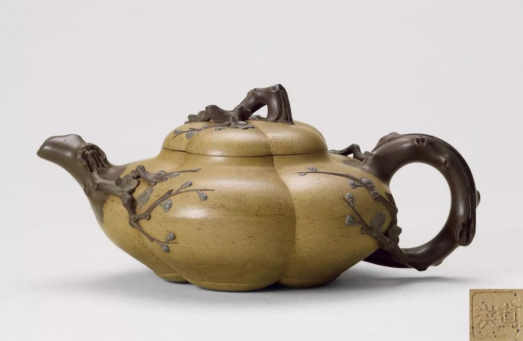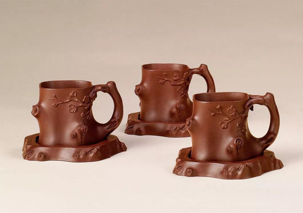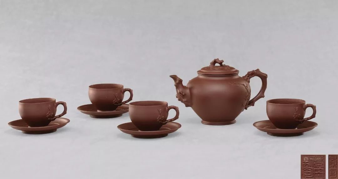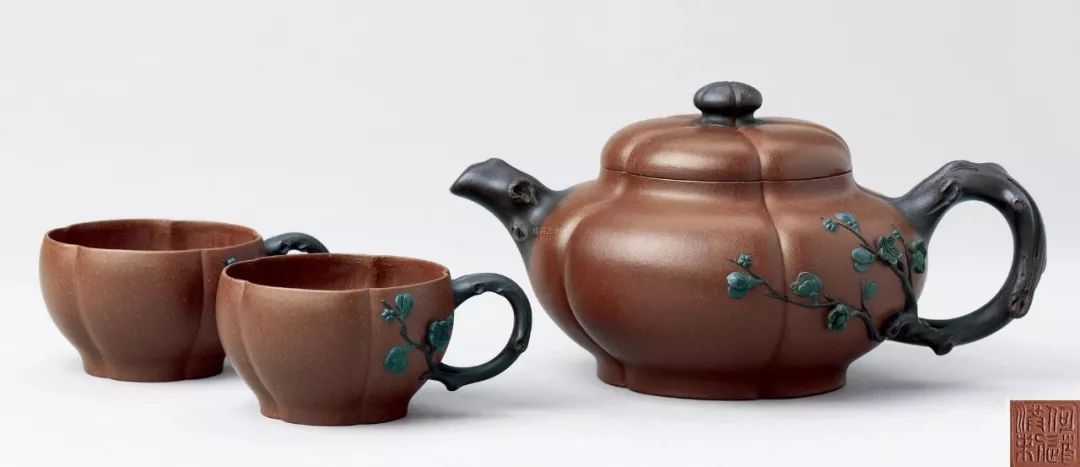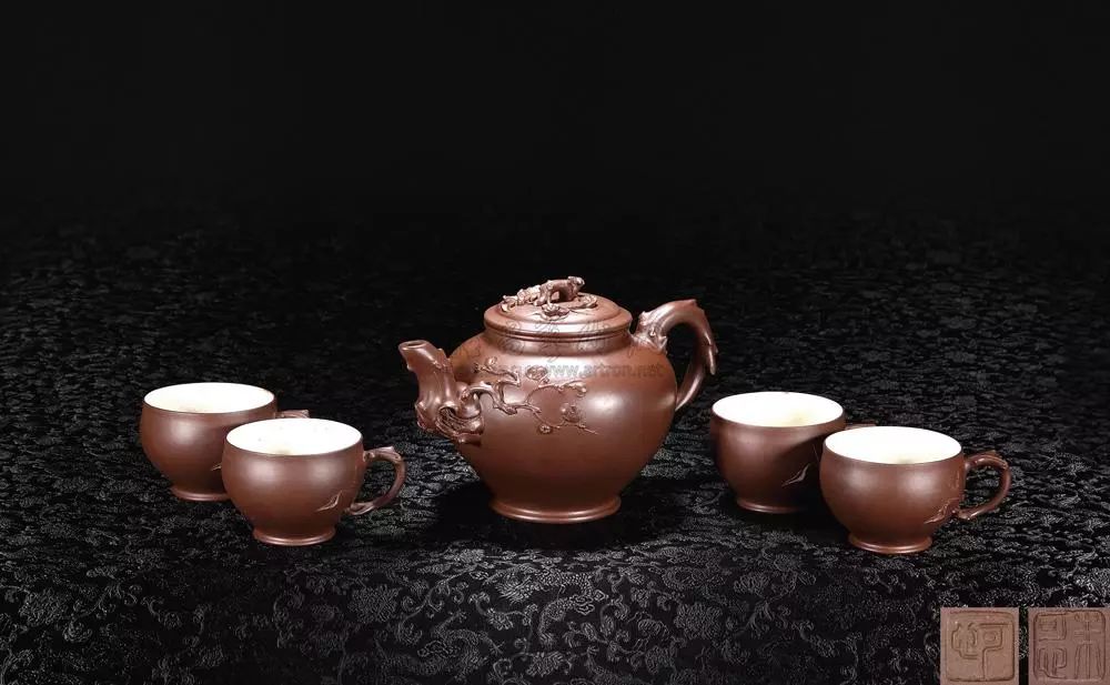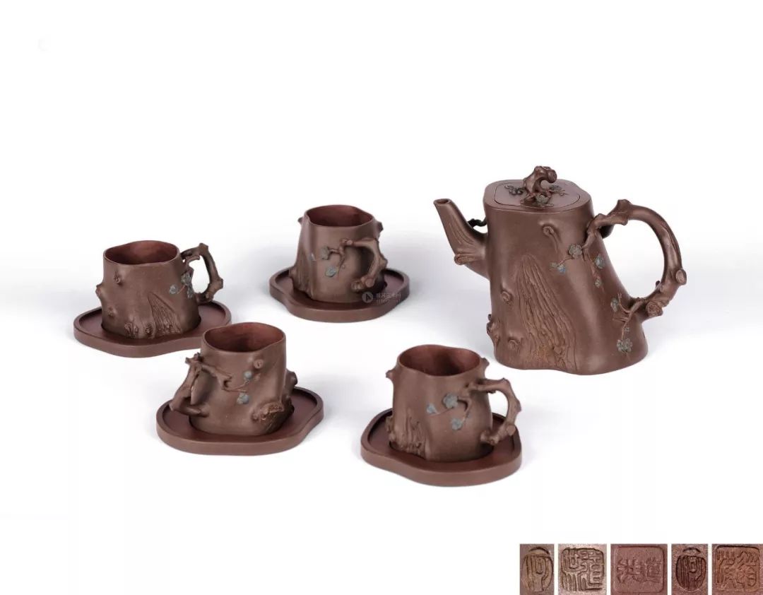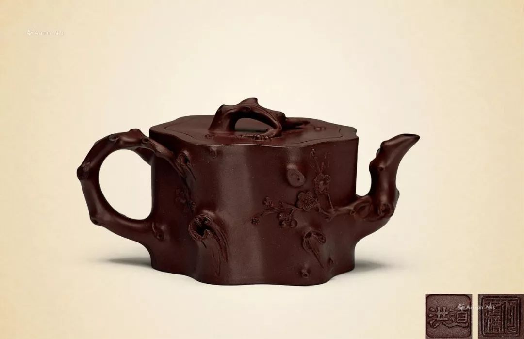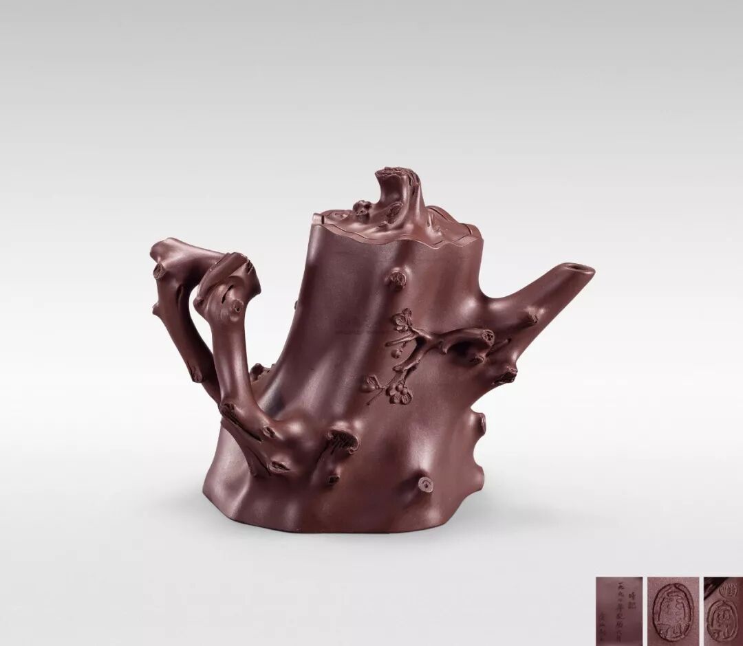 短粗梅干为流,神韵流露,弯梅枝成鋬,由下横陈出点点梅花于壶身,壶流、壶纽和壶鋬以老梅枝干诠释梅之形,各具神态,壶盖形若清雅香远的梅花。整壶以花苞及绽放的梅花妆点壶体,与壶浑然一体,视之如观一幅立体的春日问梅图。此壶立意新颖别致,造型简谱浑厚,以简脱繁,形、神、器皆佳。枝与结疤布置合理,伸展自然,老干新枝,争奇斗艳,做工极为精致,曾为宜兴陶瓷博物馆珍藏之宝。壶身、流、把、盖全部是用极富生态的残梅桩、树皮及缠枝组成,作品是一件强而有力的雕塑,壶上的梅花是用堆花及贴饰手法,将泥浆层层堆积塑造成树皮状,栩栩如生。此壶为古梅梅桩造型,壶体为一不规则若圆筒形的梅树桩,结疤错落有致,或凸起或斑斑驳驳。枝上梅花形态各异,多姿多彩,有新绽开的梅花,有含苞待放的梅骨朵,栩栩如生。梅枝干、桩头、梅树瘿节生长自然,宛若冰肌铁骨之势。壶盖平坦,与壶体嵌合严密。通体观之,梅桩茶具刚劲有力,比例协调,气韵浑朴,一派天成。此壶的壶身,流把、盖用极仿真的手法来捏塑,梅花采取贴花法塑,栩栩如生。作品气韵生动、整体协调,并酷似自然生态,维妙维肖,具有浓厚的东方艺术文化特色和高雅的艺术欣赏价值。壶体以一截梅桩为造型,壶嘴、壶钮及端把均为梅枝状,小巧精致的梅花自壶钮及壶把处自然胥出,正、侧、反姿态各异的花苞疏密有致的分布于壶体,平添一份柔美。壶身突出梅桩苍劲的节疤,数目纹理清晰,有一种参差之美,娇艳的梅花和老辣的梅桩形成强烈的反差,寓『枯木逢春』之意。