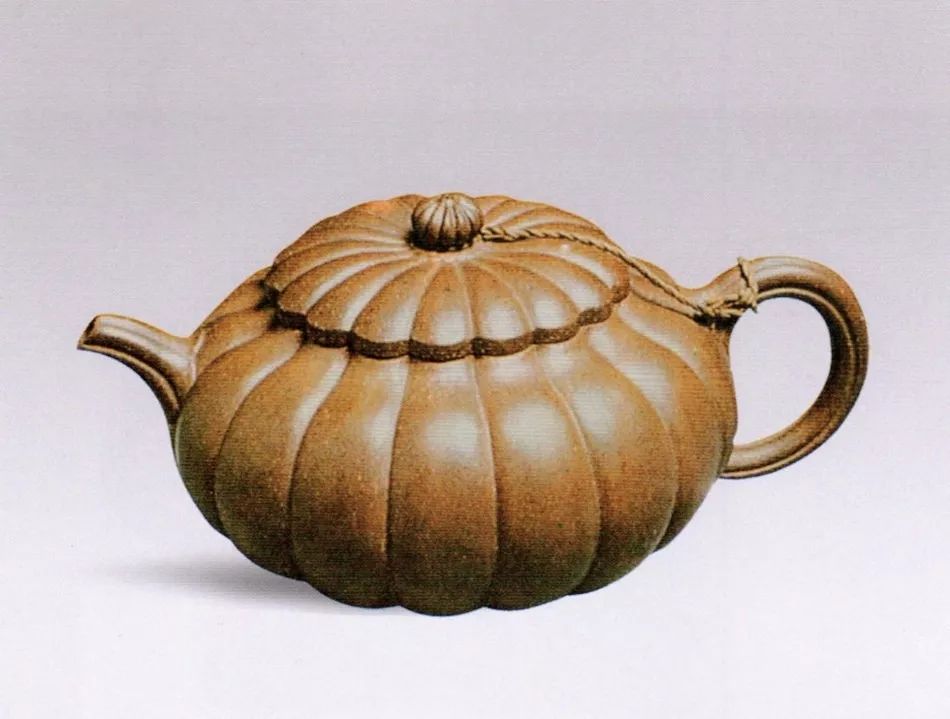 此壶呈淡黄色,砂粒隐现,以较密的瓜棱均分壶身,凹棱线自钮至底相交成一点,制作严密、技艺精湛。