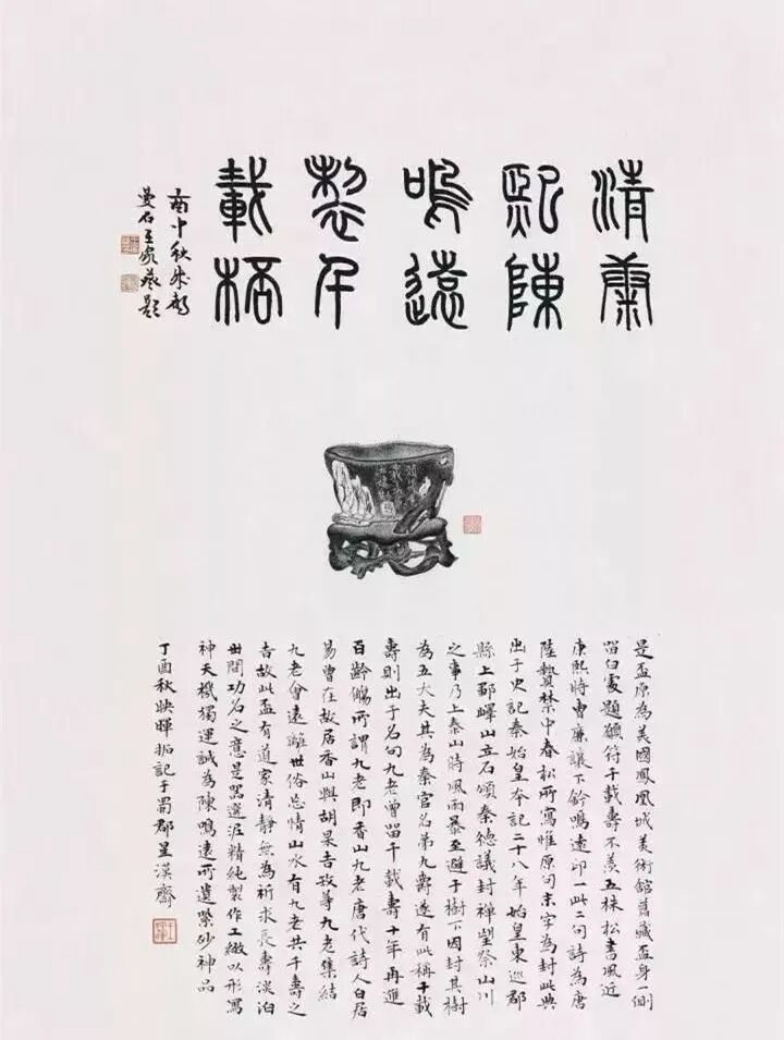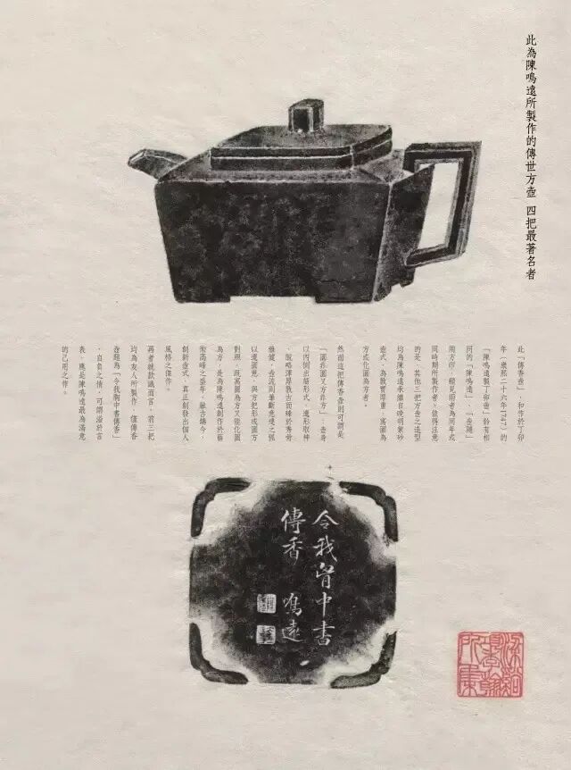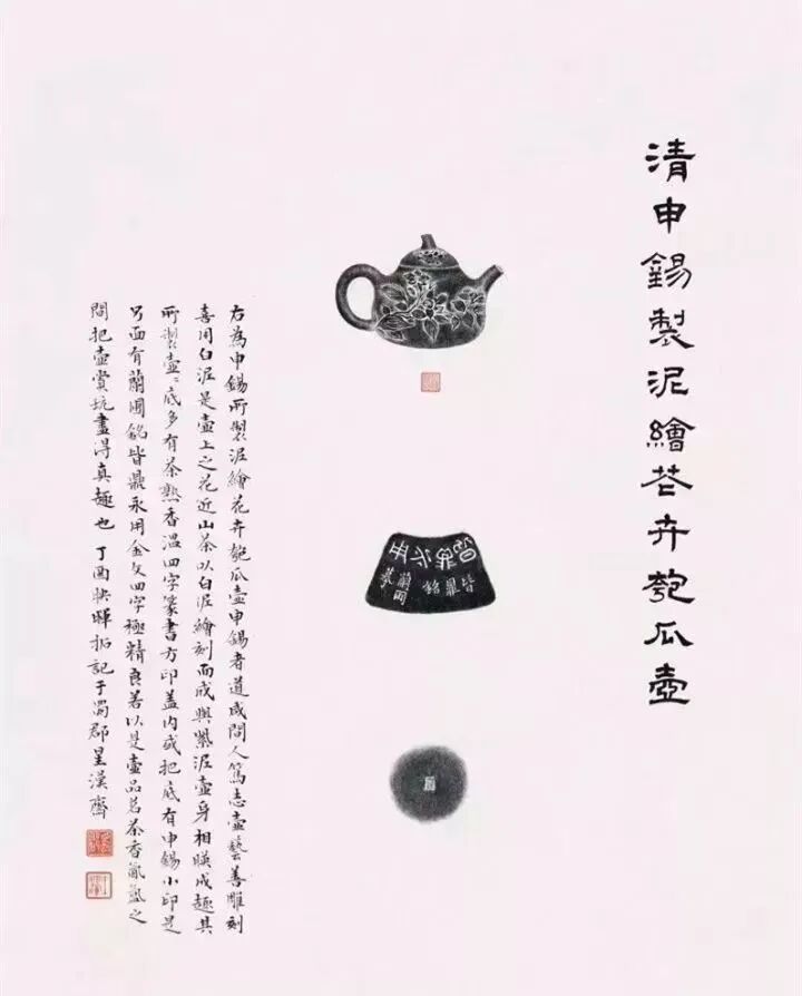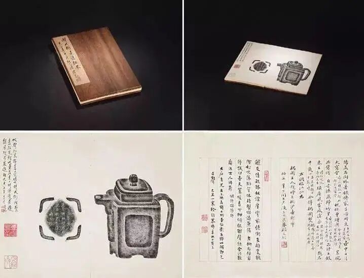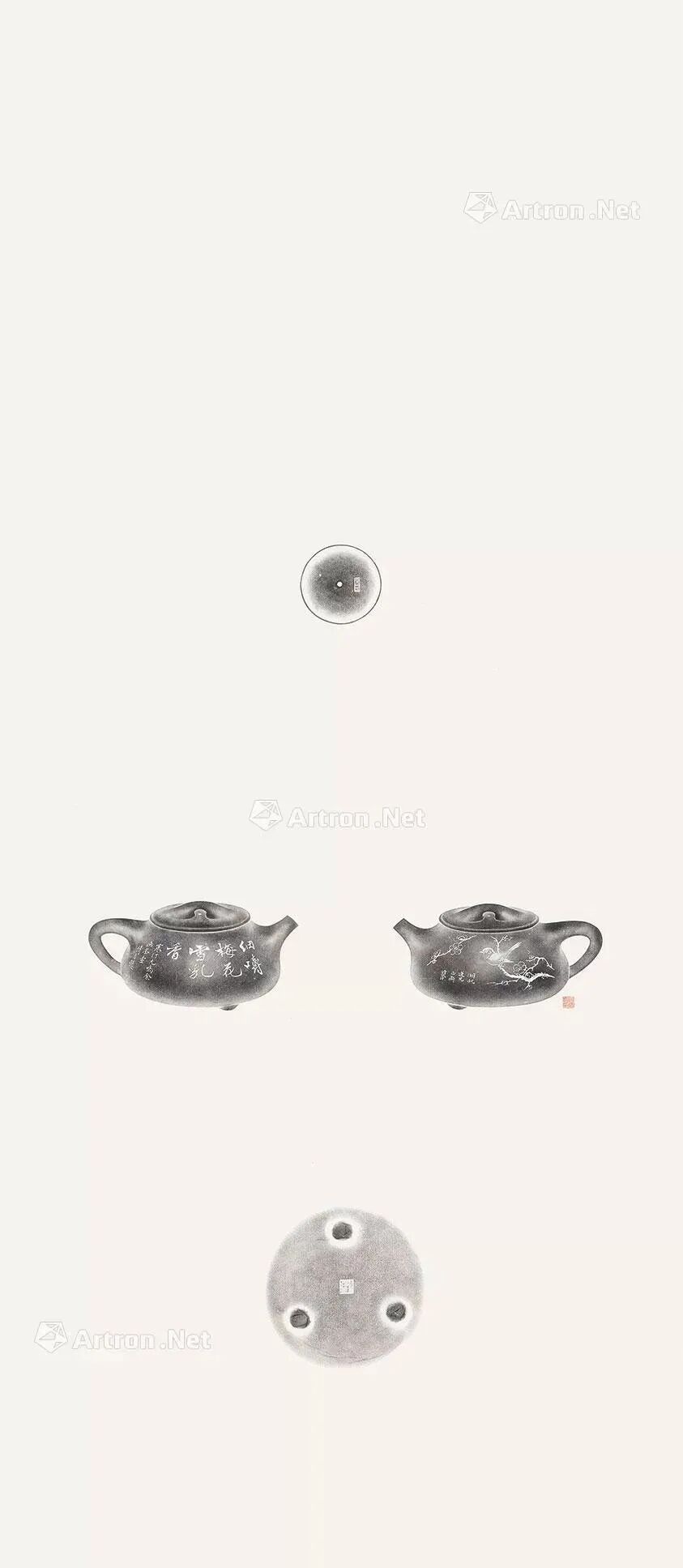 在照相技术诞生以前,那些已经损坏消失或因种种原因无法收藏的文物,就是依靠墨拓进入研究者的视域的。 墨拓可以将石刻、古器物上的文字和图案清晰地显现在纸上,供研究者利用。墨拓的出现远在甲骨文被发现以前,对于研究历史文献、文物有着重要的价值。 紫砂墨拓,包括全形拓、陶刻作品的平面拓,逼真的展现出紫砂器物的具体风貌,同时满足了士人对器物的追求和对书画的爱好,最终以一种“卷器咸陈”的方式于纸上全面呈现了紫砂壶的状态。 如若要将器物的全貌立体拓下,一般称之为“全形拓”,也就是紫砂墨拓的一般形式。据说,清代嘉道年间镇江焦山寺僧人六舟和尚为大学士阮元所拓青铜器全形为全形拓之先河。 唐云藏大彬拓片 全形拓,以墨拓为主要手段,结合素描、绘画、剪纸、刻纸等技术,将青铜器的立体形状复制在纸面上,成品富有立体感。 从某种程度上讲,就像照相机所拍的照片一样,对青铜器物进行逼真的描写。书斋中的古壶全形拓,寄托了时人对于古代的追怀、憧憬与构想。 陈鸣远制千载杯拓片 当年,顾景舟与吴湖帆、江寒汀合作的大石瓢,如今已经非常出名。鲜为人知的是,著名传拓艺师汪黎特曾为其作全形拓。 “拿到器物首先得用手摸,表面的凹凸肉眼有时看不出来。确定拓印的角度之后,我们会对器物拍照并制作详细的操作图。”据其介绍,光是拓印吴湖帆题字部分,前后就花了17天。 全形拓需要在平面上呈现器物的立体感,因而其难度主要在于以尽可能精确的透视关系,比较全面地反映器物之“形”。 在正式进行拓印之前,“3张废纸”往往是免不了的代价。“一张纸用来拓印器物的不同部分,将拓纸拼贴起来,另外两张分别确定器物文字、图案如何变化以及墨色深浅,这都是为了准确反映肉眼可见的透视关系。” “拓印‘梅花小鸟’单面,就移动了15次。”拓印过程中,由于墨色的反光效果,上墨的人往往不清楚拓印效果,这就需要旁人仔细观察并控制用墨量。 同时,他们还得根据事先制作的操作图不断移动纸张,以制造全形拓的透视效果。由此可见,完成一件全形拓是多么不易。 关于紫砂拓片,有不少被整理留书成册,流传有序,清末民初的收藏大家项季翰为其所藏紫砂作品留有拓片,集成《砂器拓影集》,陈鸣远制「传香壶」就收录其中。 还有《曼生遗韵》一书,收藏家唐云先生的八把曼生壶拓片皆收录其中。 八壶精舍摹古曼生壶八把 唐逸览补曼生八式壶拓片花卉八帧 传香壶墨拓 故宫博物院著名传拓专家纪宏章先生曾说:“我认为一幅好的全形拓片,必须是结构准确、立体感强、细部清晰明确,黑、白、灰墨色层次清楚、协调合理,有良好的整体效果,才算上品。” 杨彭年制紫砂竹笋水注及全形拓 诗文拓印细节 紫砂拓印综合了紫砂器形之美、陶刻金石之味、书画文人气息。紫砂拓印,尤其是名家名作的拓印,除了艺术价值,还在于其资料保存研究的价值。 紫砂拓印清晰、完整、准确、生动、真实地再现了原作的神韵,其所记录、表现出来的内容,都是极其宝贵的资料。 申锡匏瓜壶拓片