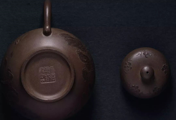 此壶盖内落有一小方章:熙臣,正是作者之名。王熙臣(1906—1960)是民国时期宜兴制陶高手,曾受雇于上海“吴德盛”等著名陶器商号。有些图典书册都说其制陶以莲蓬壶为最佳,而据此壶看去,其工艺之精比莲蓬壶有过之而无不及。壶底还有一枚方章:裕民陶器出品。民国时期陶器店号商号层出不穷,能请到任淦庭、王熙臣这样的名家制壶,这裕民陶器自然也不一般。