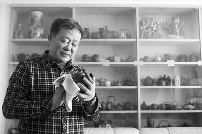谭戈的生活离不开茶壶,每天晚上回到家,他一边看电视,一边用茶布轻轻地摩擦着茶壶;即使出差,谭戈也会在包里放上一把小茶壶,随身带着走。“我的床是订做的,床头就是一个博古架,上面放满了我的珍藏,”谭戈乐呵呵地说,“这样,我一躺下,头顶就是茶壶,一睡醒,第一眼看到的就是茶壶。”