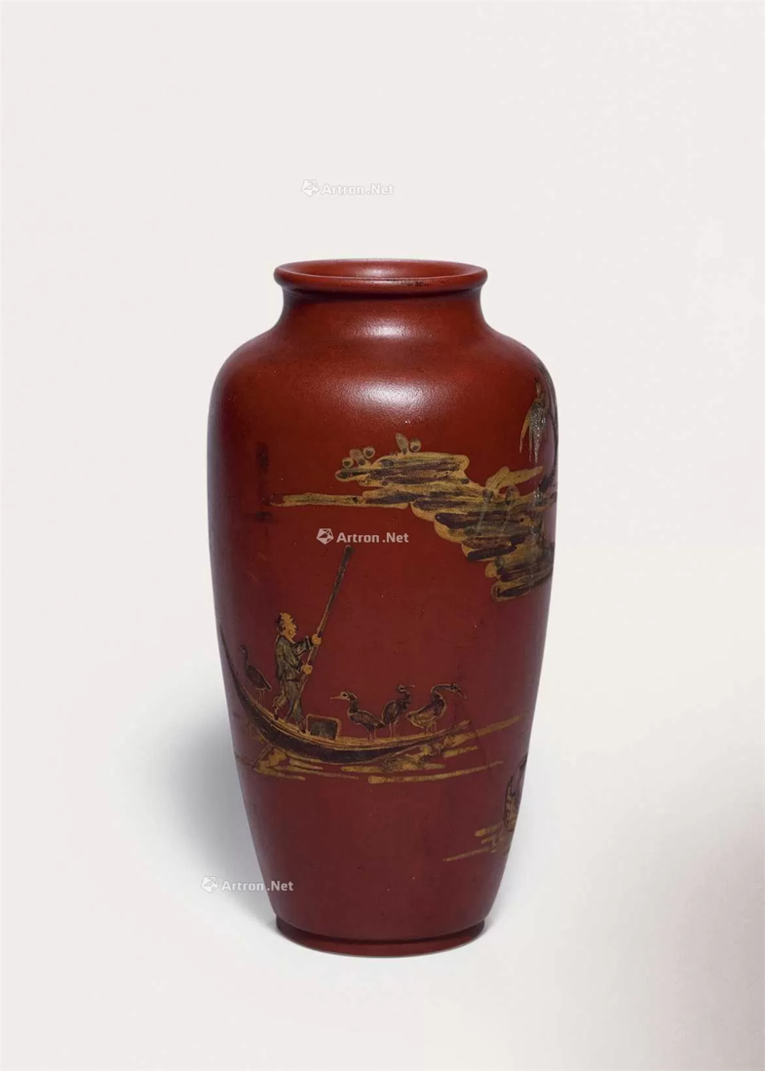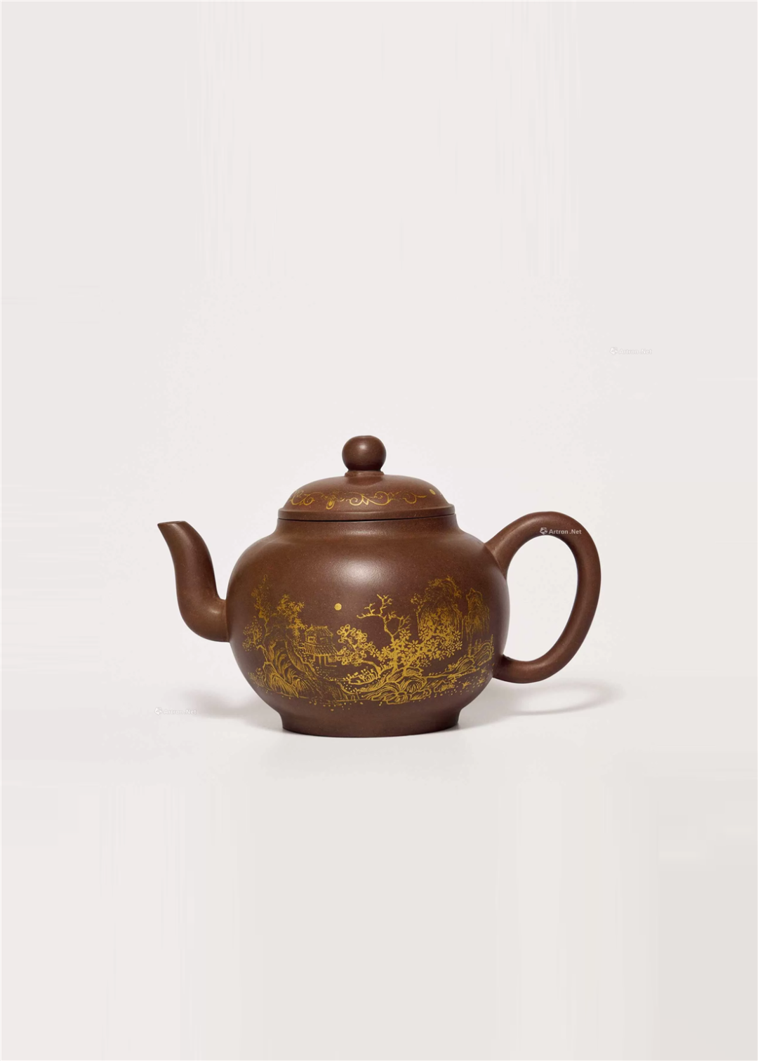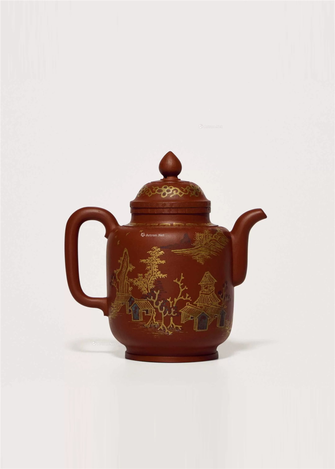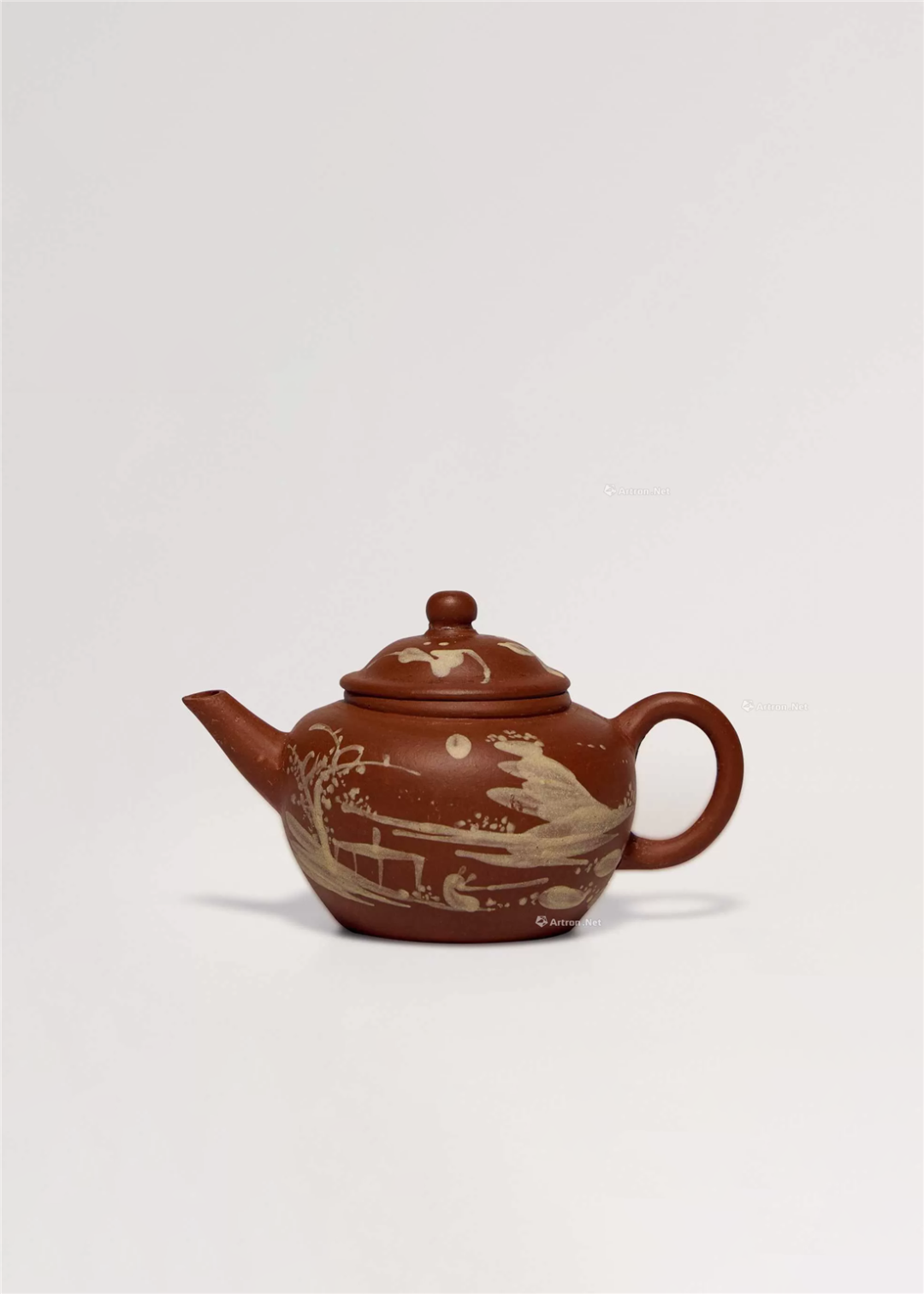 0170 清中期 孟臣款 江上吟诗送白云 朱泥巨梨壶