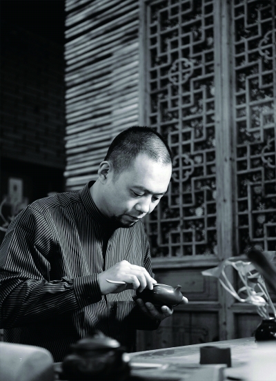 说起紫砂壶,不能不提陈曼生。陈曼生即陈鸿寿(1768-1822),字子恭,浙江钱塘人。他的本职工作是当县太爷,担任溧阳县知县。可是此人太痴迷紫砂壶了,经常不升堂、不断案,偷偷溜到宜兴去品新茗、赏新壶。陈曼生也是个才子,诗、书、画、印样样精通,是“西泠八大家”之一。出版过《种榆仙馆印谱》等许多“学术成果”。因为爱壶,陈曼生放下县太爷的身段,找到紫砂艺人杨彭年、杨凤年兄妹,与他们达成协议,联合开发紫砂新品。具体的分工是,陈曼生负责设计与篆刻,杨家兄妹负责捏制与烧成。双方优势互补、精诚合作,创作了大量的紫砂名壶。陈曼生的运刀犹如雷霆万钧,显得雄健朴茂,金石味十足,杨氏兄妹的壶线条简洁、做工规整。“名士名工,相得益彰”的韵味,将紫砂创作导入另一境界,形象地给予人们视觉上美的享受。在紫砂历史上便出现了“曼生壶”或“曼生铭,彭年制砂壶”等名词,表面看来,镌刻名士和制壶名工“固属两美”,实际上,名壶以名士铭款而闻名。虽然写在壶上的诗文书画依壶而流传,但壶随字贵。