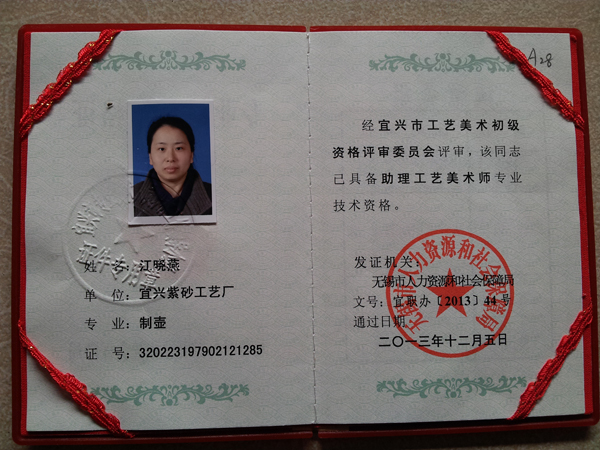 紫砂之家讯:2013年末,喜讯频传。12月5日,江晓燕老师荣升国家级助理工艺美术师。12月10日,经中国陶瓷工业协会审核批准,江晓燕老师成为其会员,以工艺美术师身份任职制壶总监。此…详情>