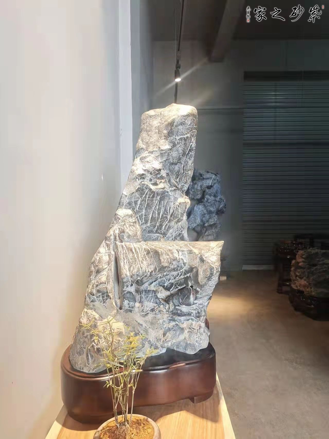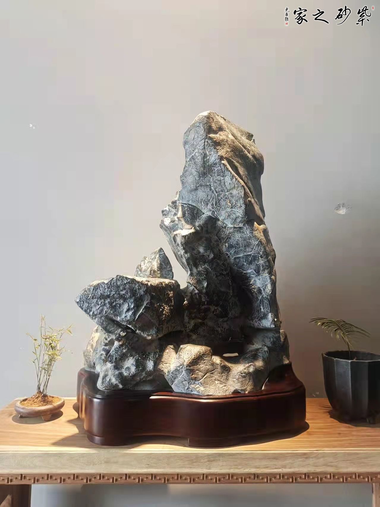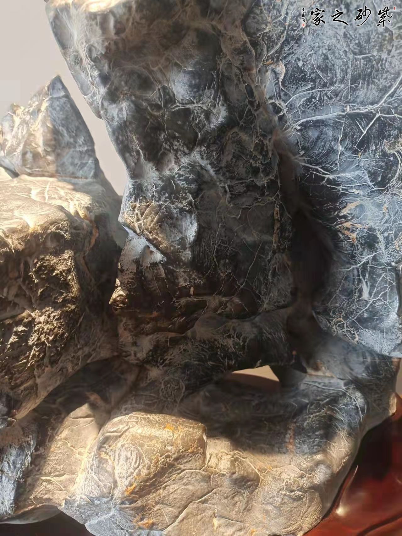 天然灵璧石,天然带小平台,体态呈三角形,象征稳定稳固,意趣天成,多面可观,石肤光滑温润,极具手感文人雅士风韵,适宜放置书房案头,“集天地之灵,成无暇之璧”,颇具文人赏石之特点