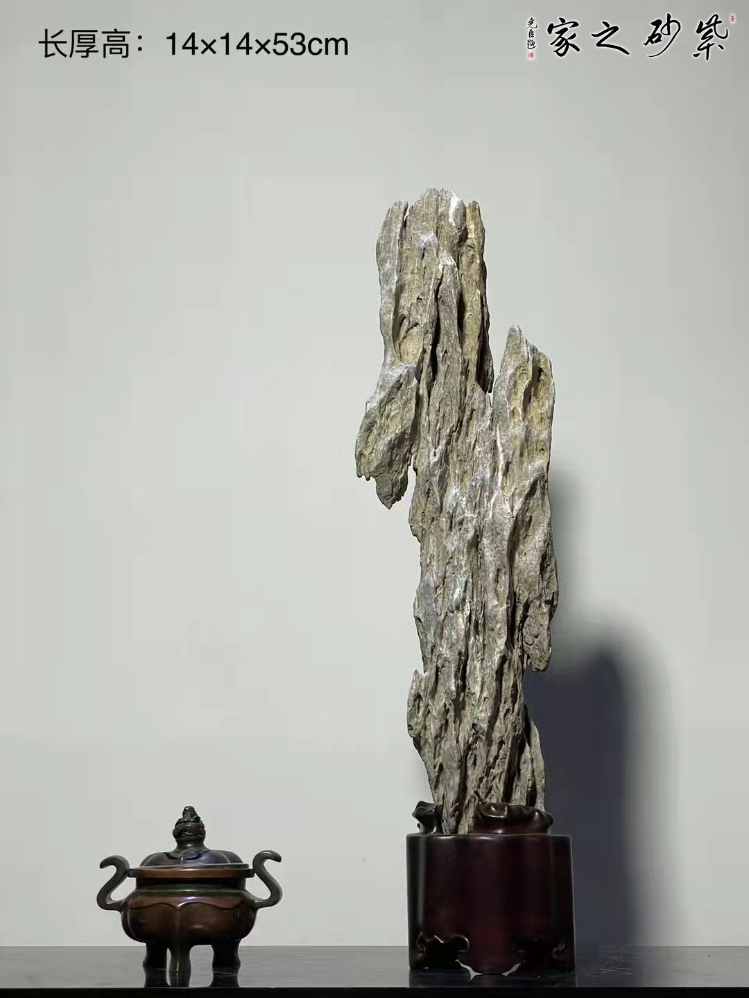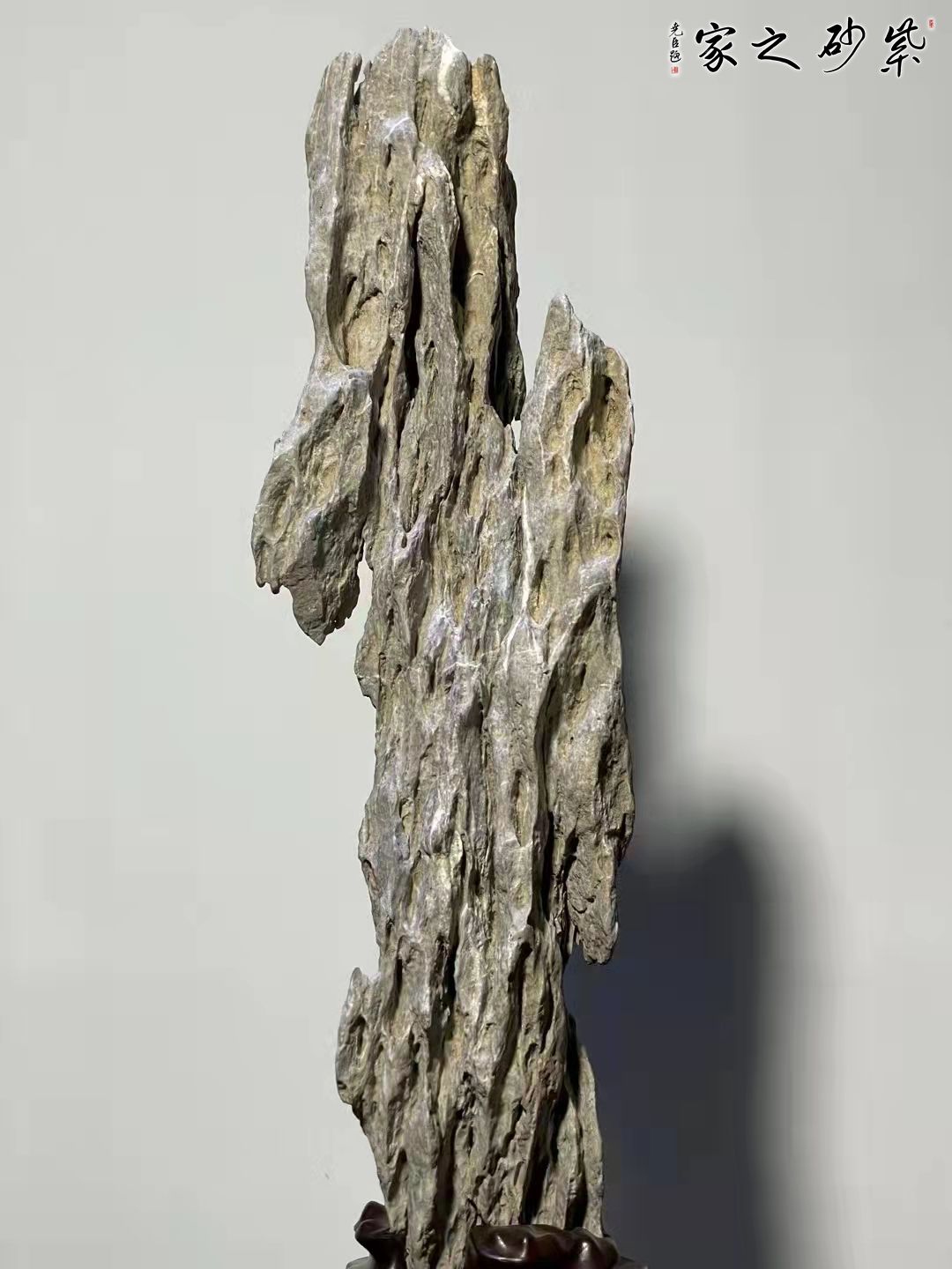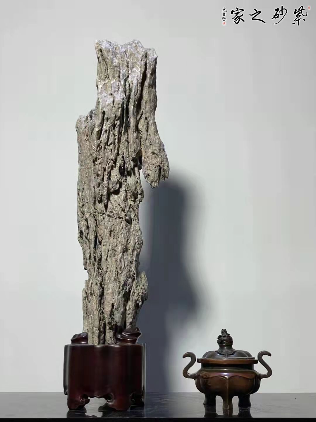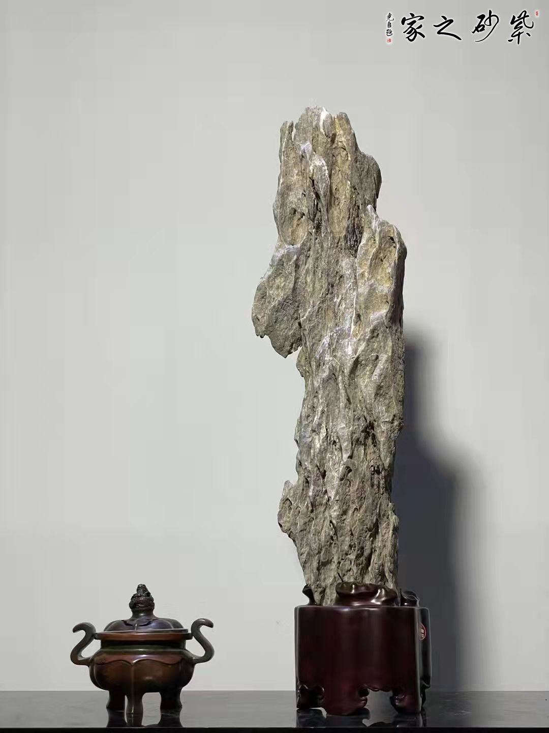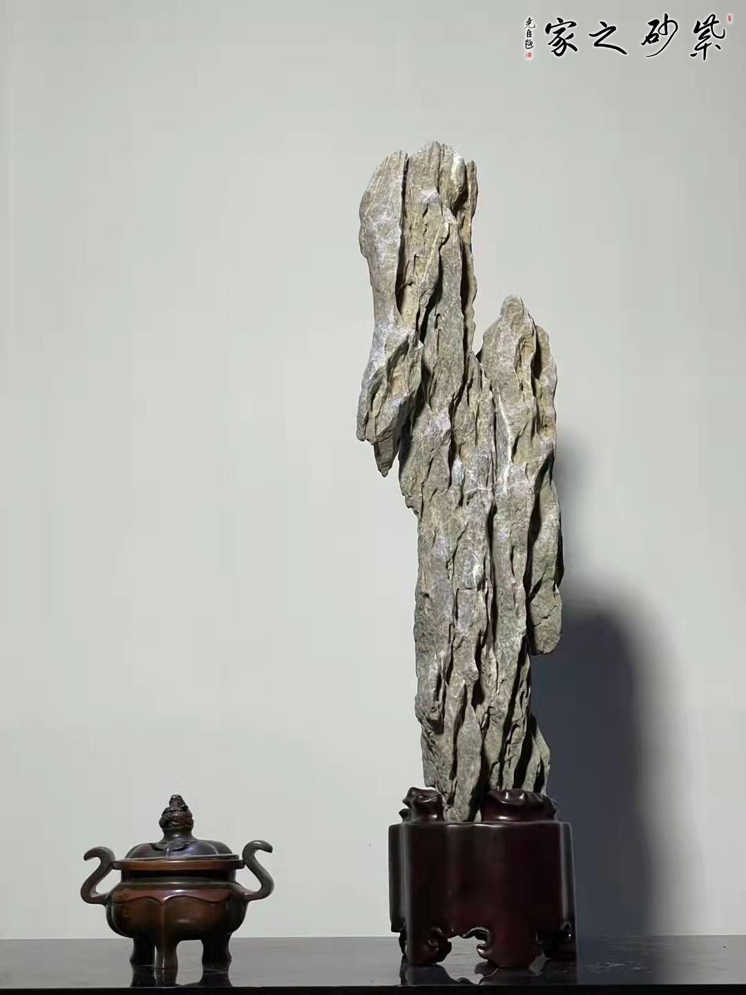 此石造型极具风韵,有型无态,肌理褶皱多变,迂回曲至,纹比波摇,观之如身临名山千仞,即可足不出户,卧游千里而神极天宇,尽享山野天然乐趣,乃文人雅士之大好。