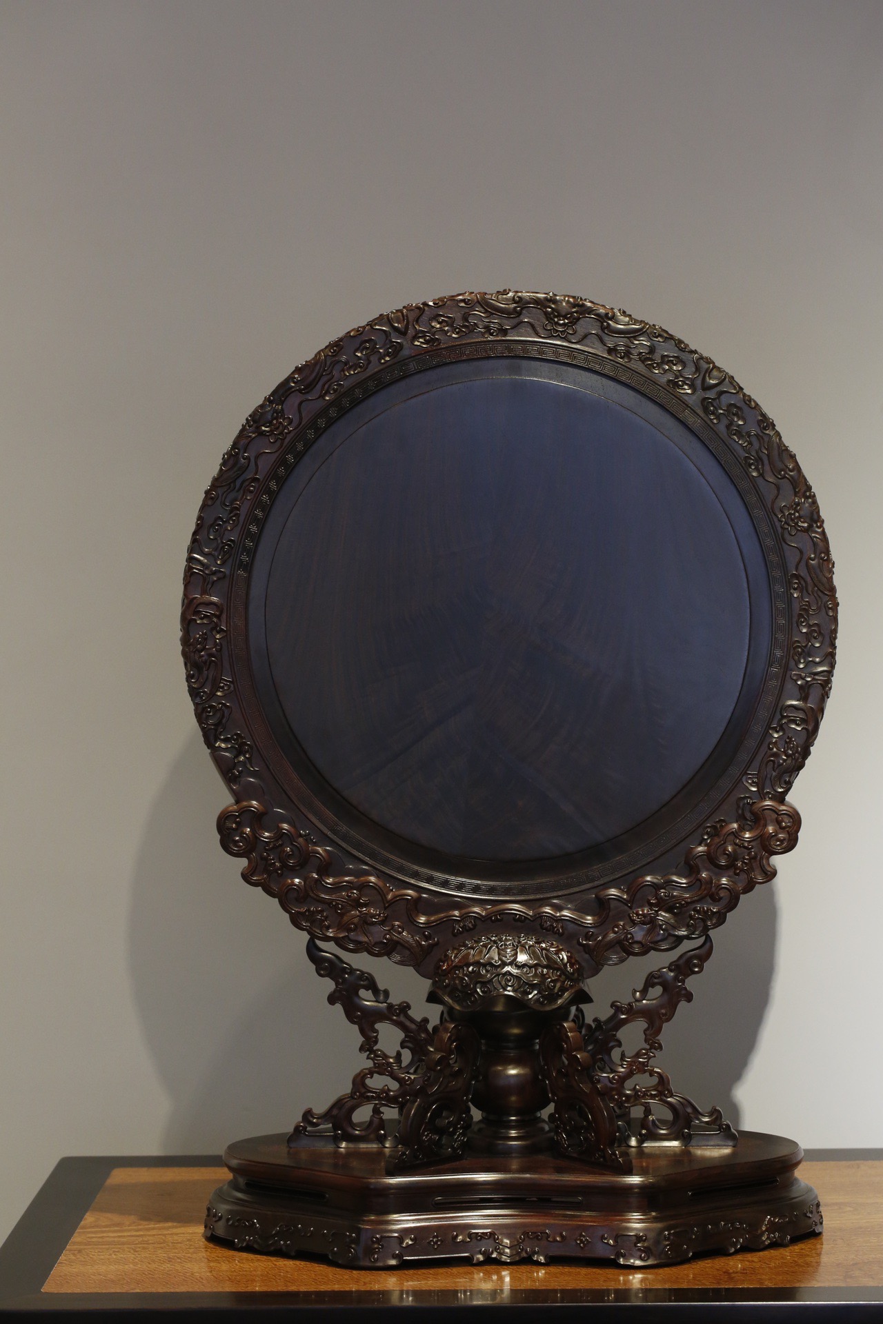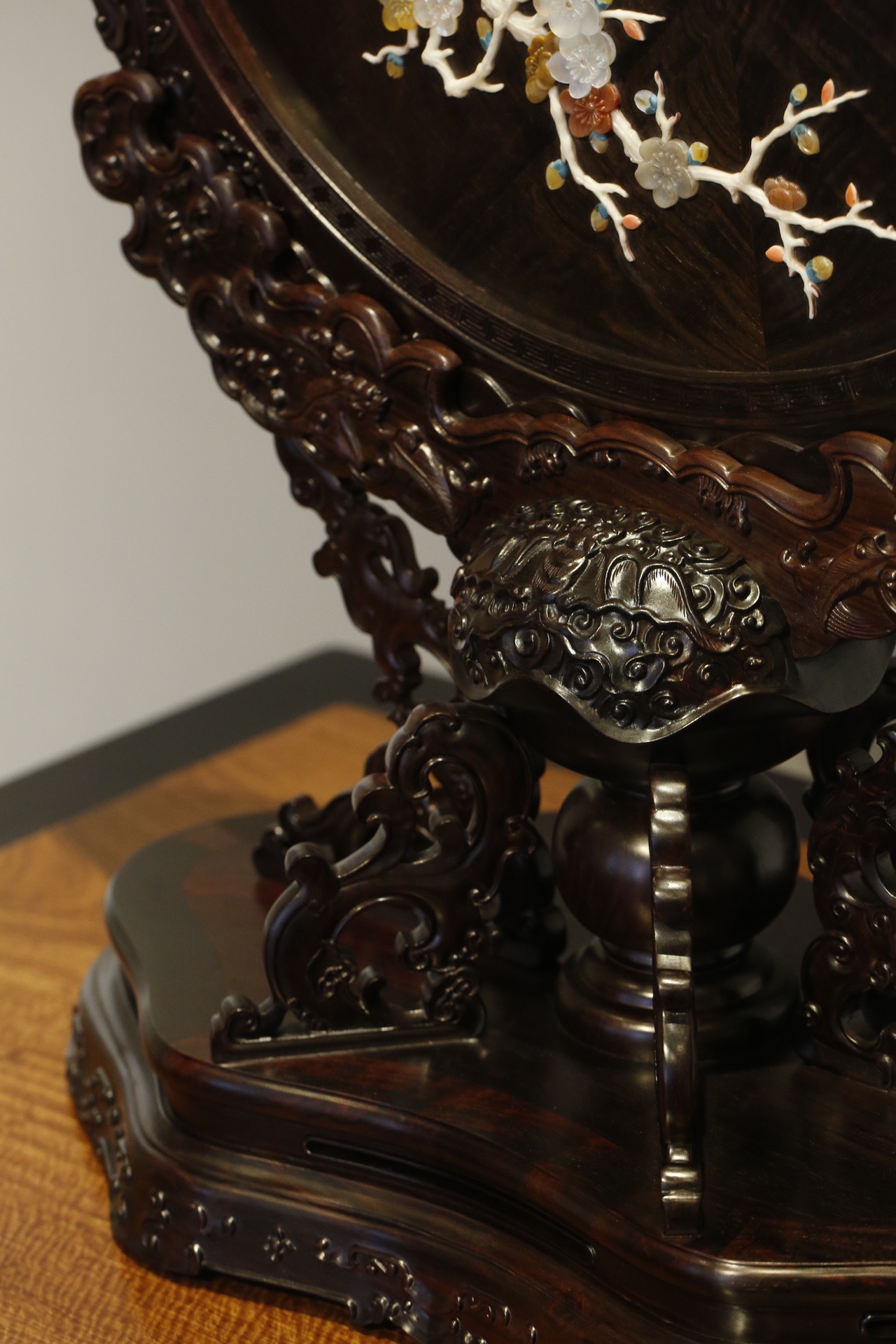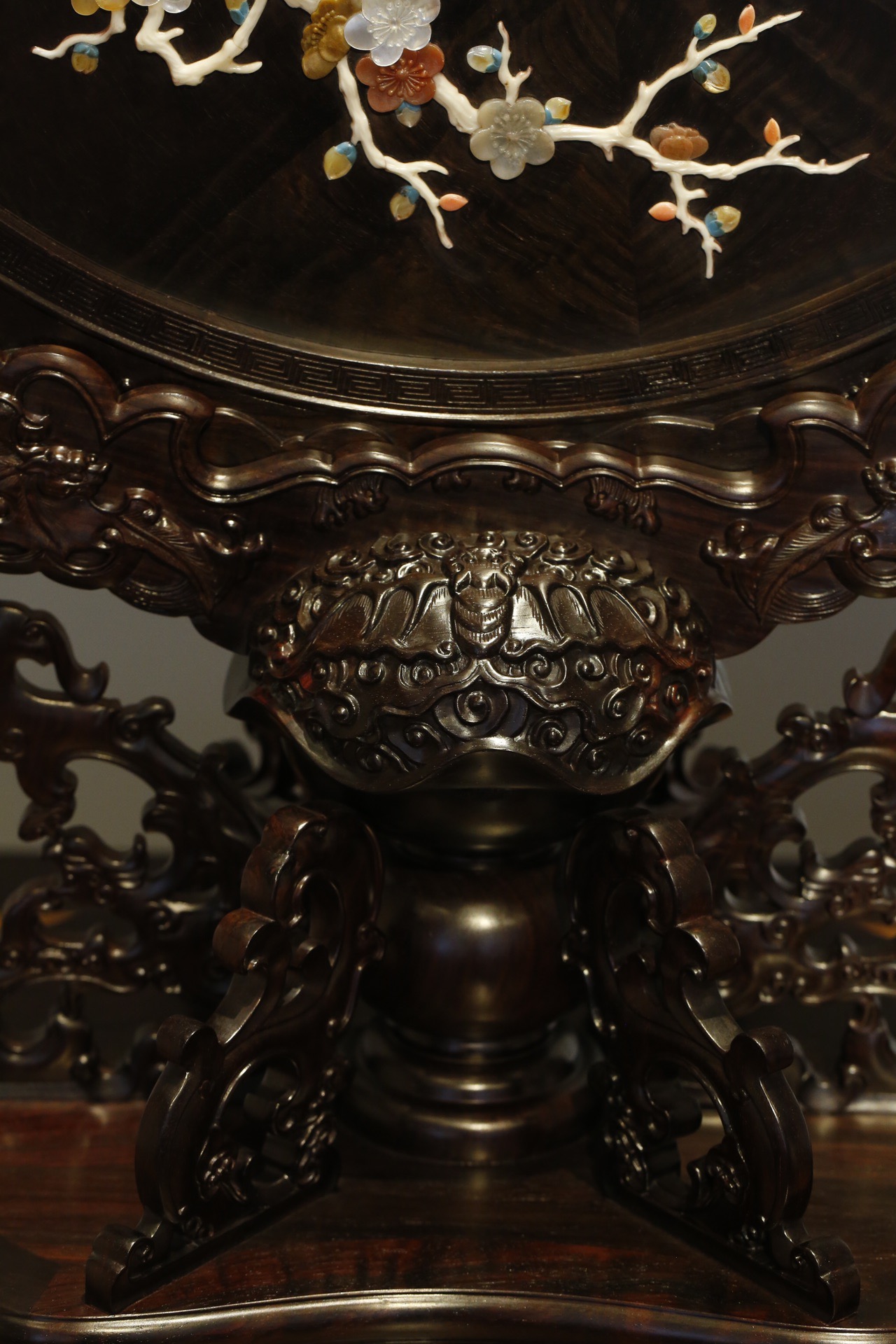 通体以老挝大红酸枝老料为材,器体硕大,上呈圆形厚片状,屏芯以百宝手工镶嵌喜上眉梢图,清新脱俗。下呈展翼,雕如意卷草海浪蝙蝠纹,寓意祥瑞,宝瓶独梃屏座,安卷草夔龙站牙。海棠形基座,矮束腰,下承牙板雕古玉纹。长53 宽24 高77cm