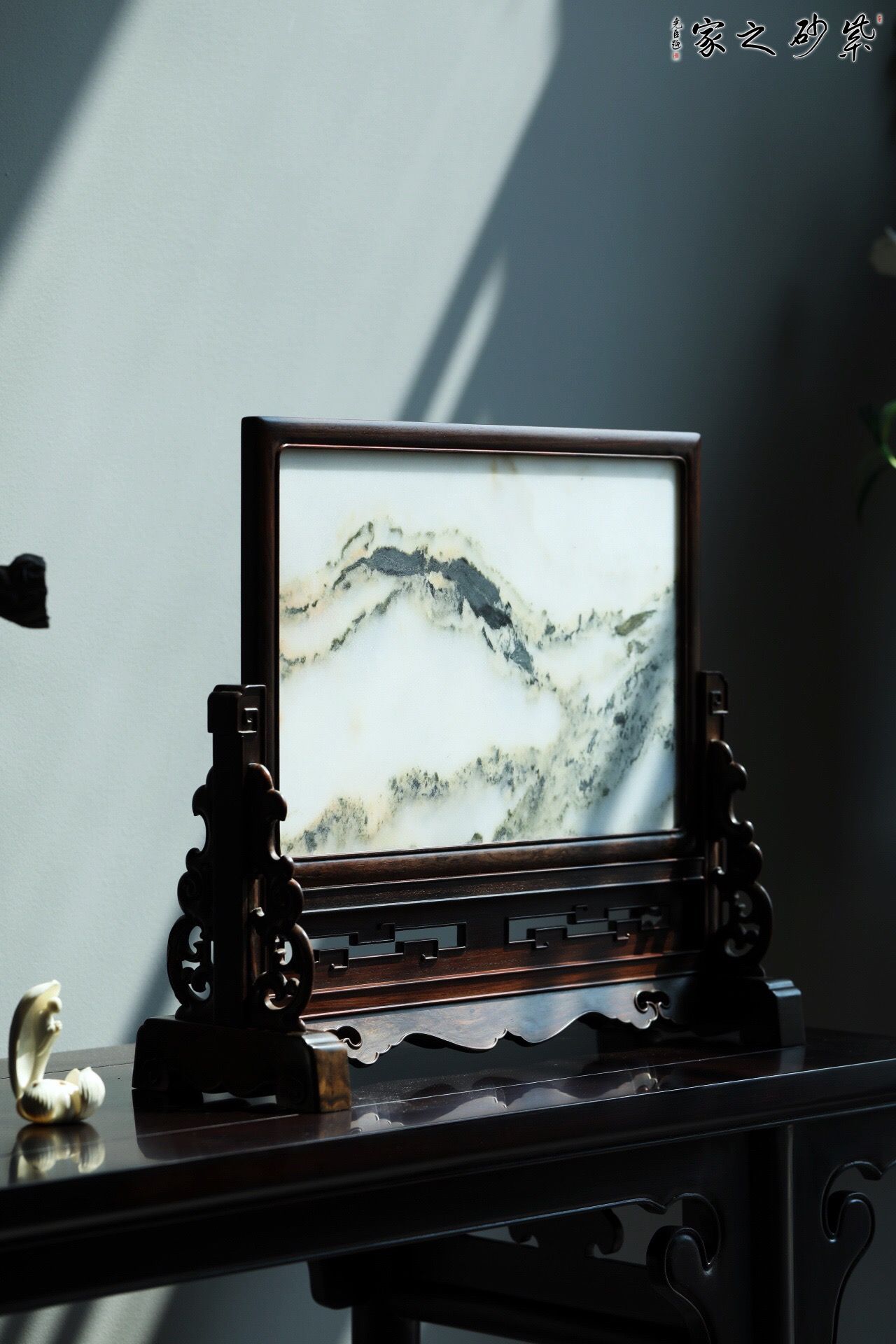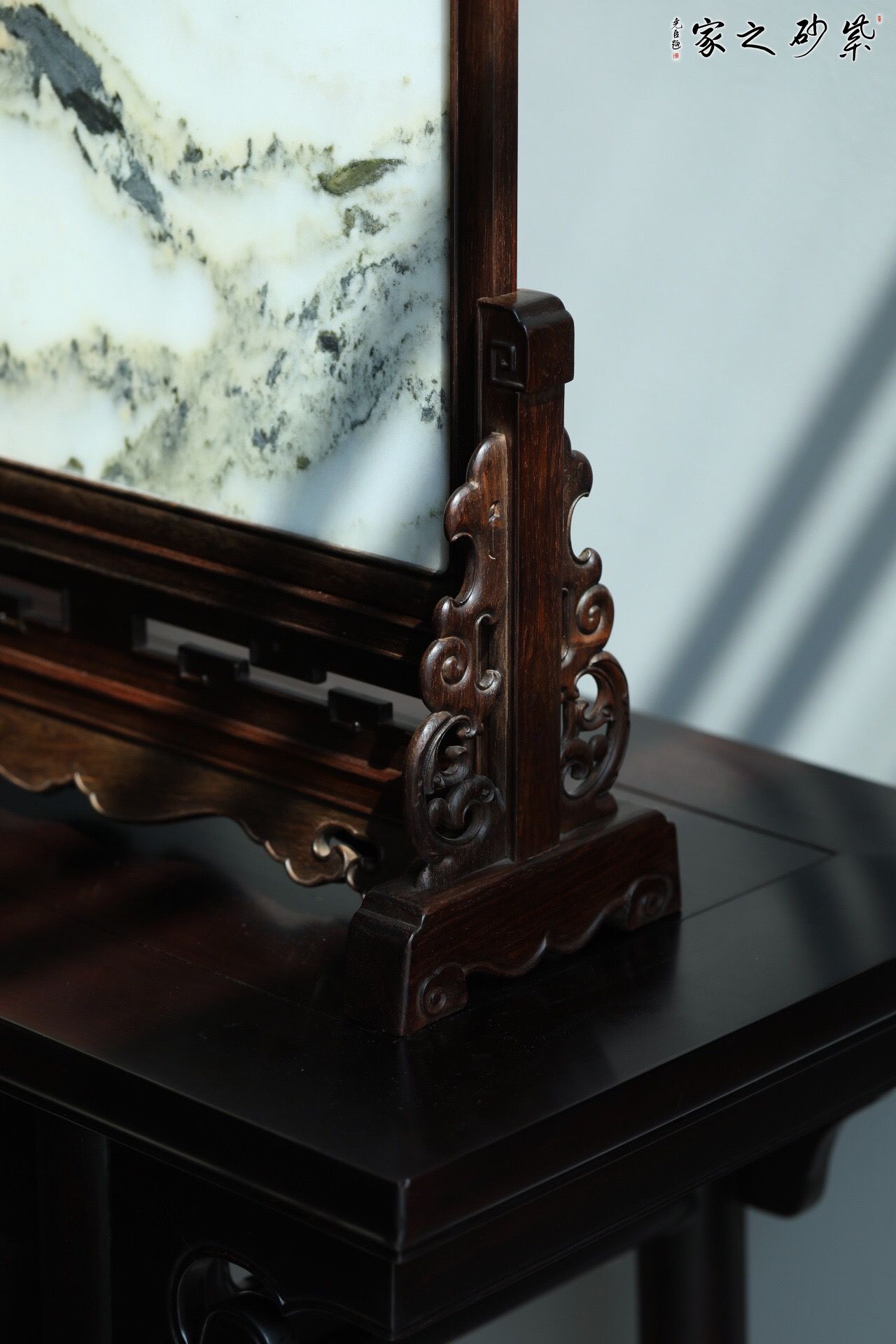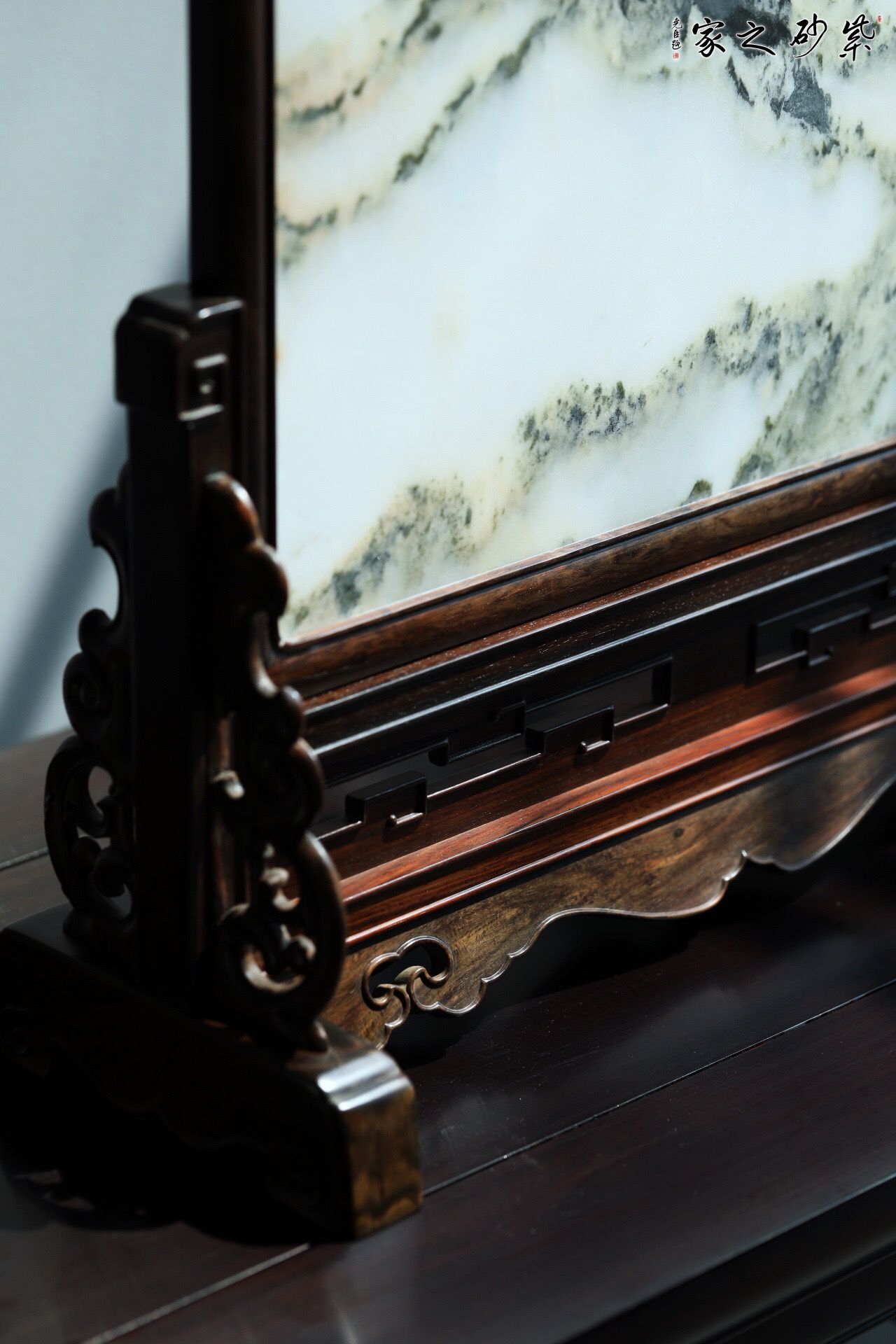 插屏屏心选用天然云石,石纹与山水画神似,连绵不断的山峦,近浓远淡。外框选用大红酸枝为框,底。底座刻如意祥云纹点缀其间。插屏规整漂亮,天然的山水纹屏心自然逼真。外框酸枝油性十足,包浆莹润。