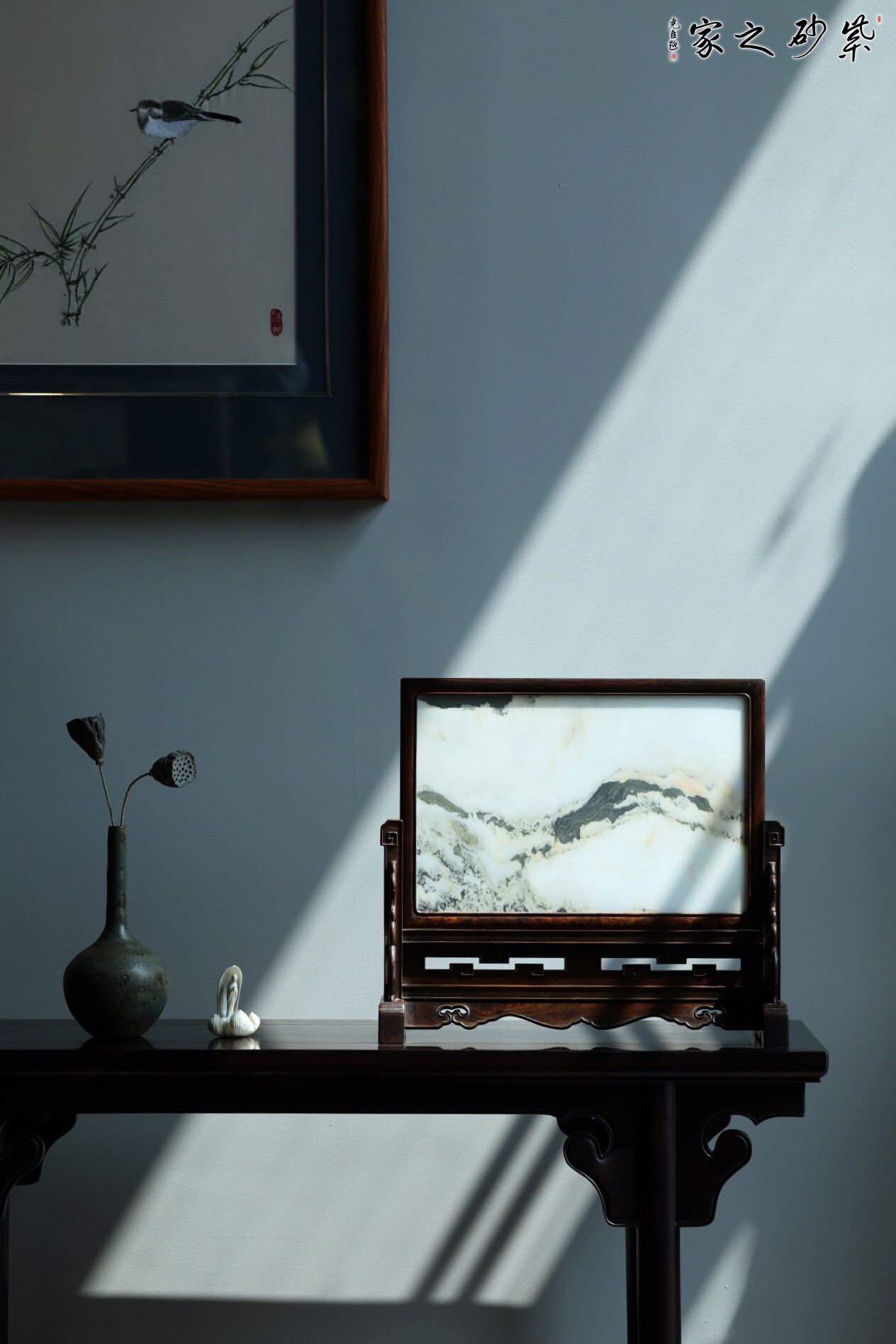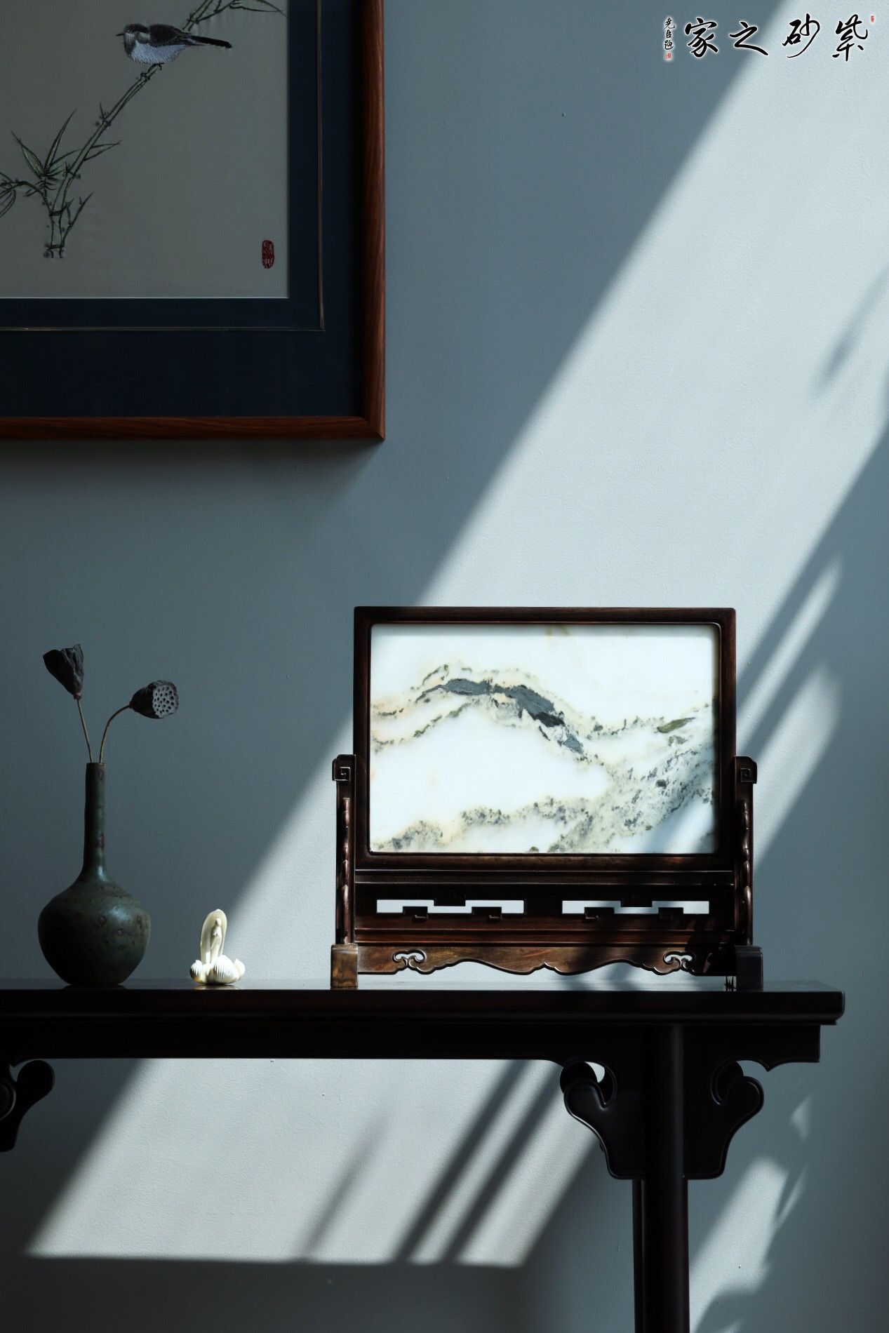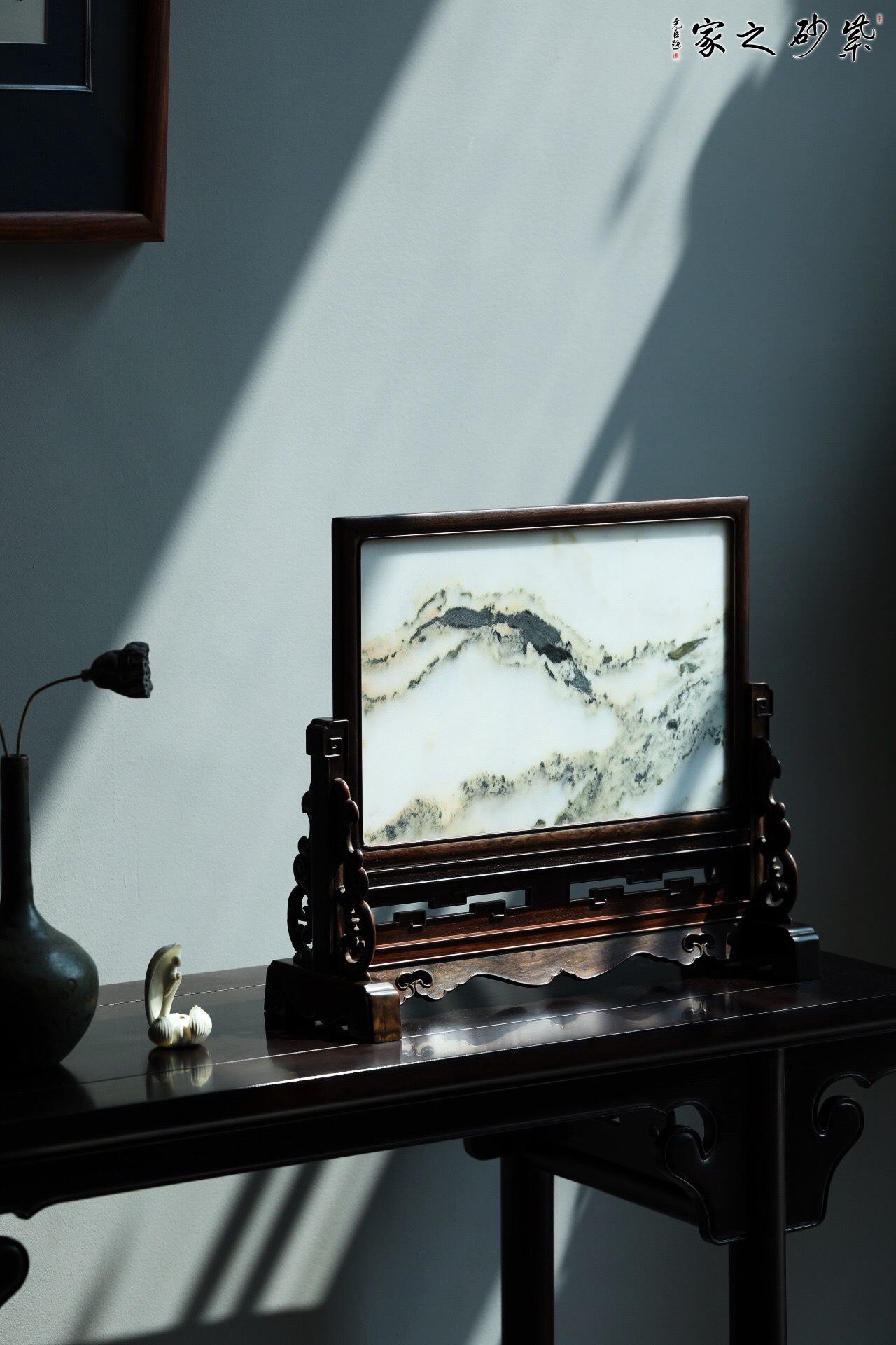 插屏屏心选用天然云石,石纹与山水画神似,连绵不断的山峦,近浓远淡。外框选用大红酸枝为框,底。底座刻如意祥云纹点缀其间。插屏规整漂亮,天然的山水纹屏心自然逼真。外框酸枝油性十足,包浆莹润。