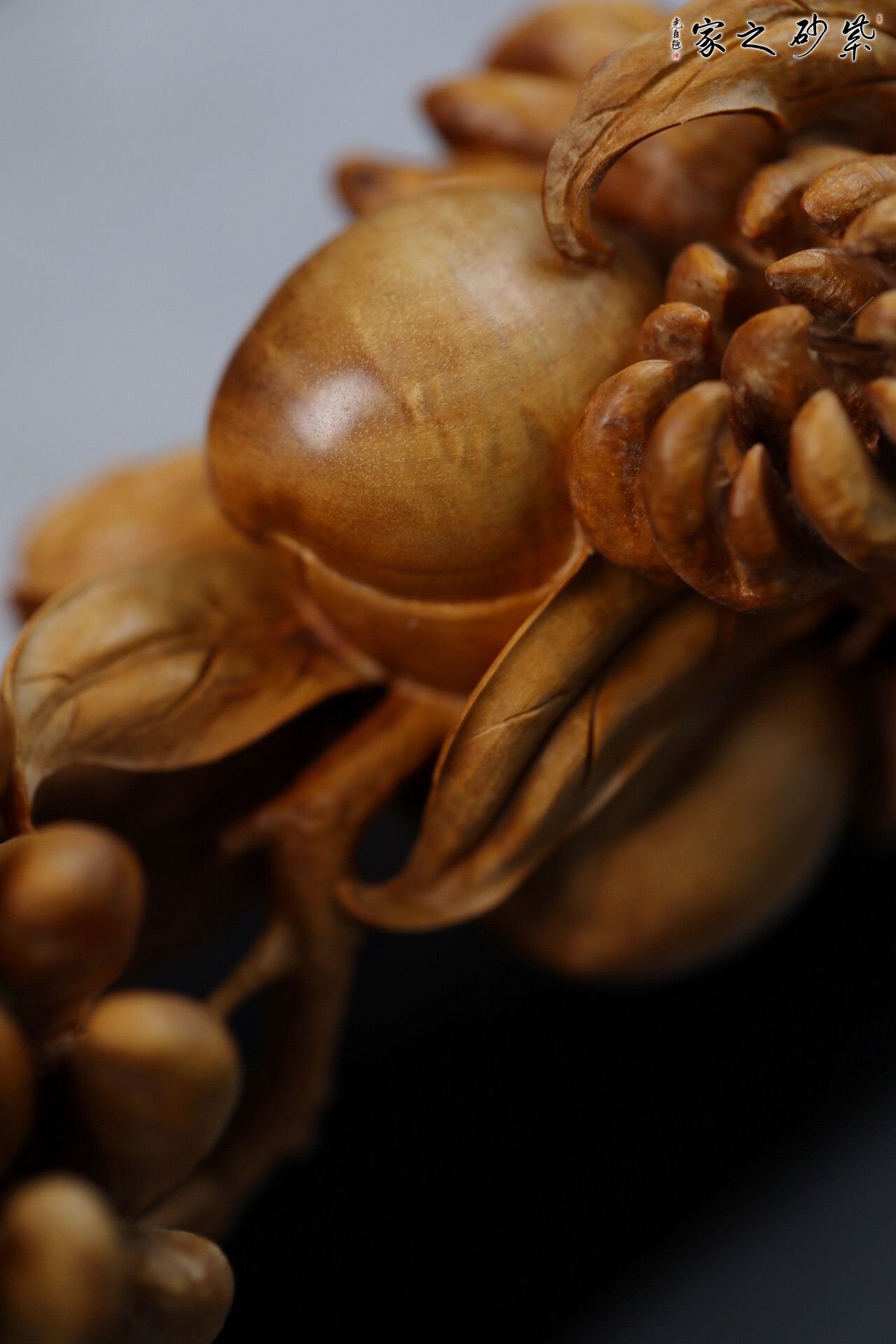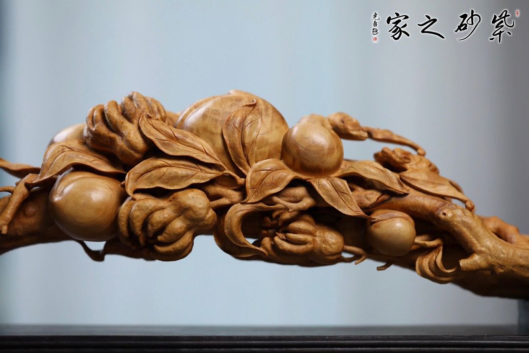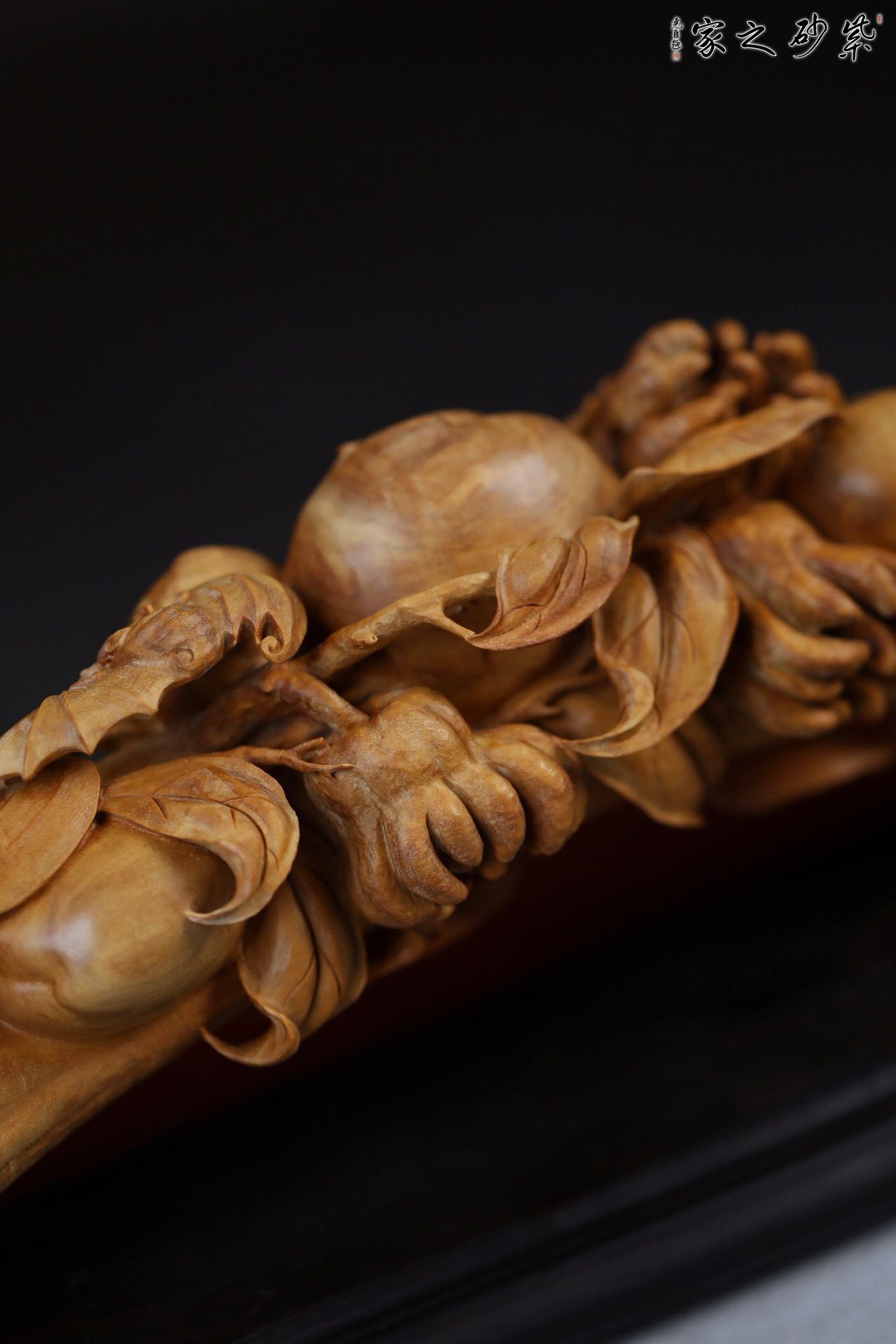整料雕刻,缜密布局,枝嶙峋虬曲,秀叶舒展自如,蝙蝠跃