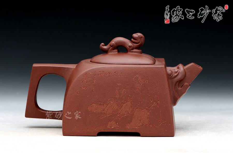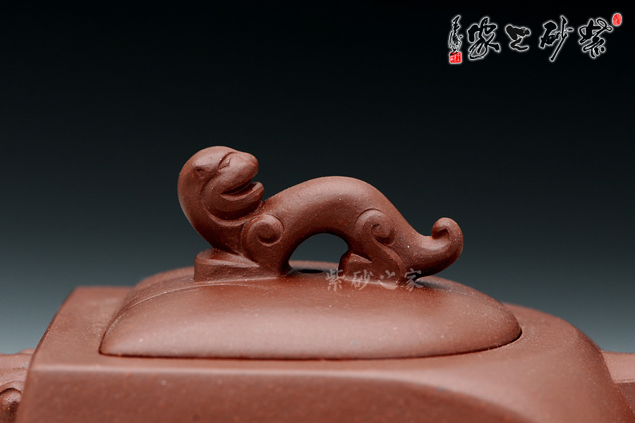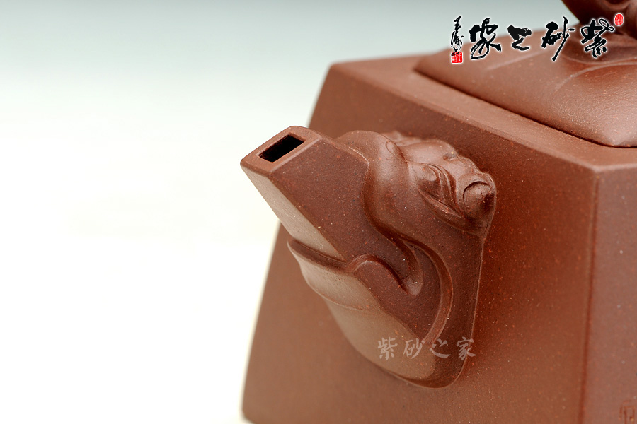 一见此壶便觉霸气十足,壶身半方半圆,四足稳稳落地,掷地有声。整个壶型从壶嘴到壶把,前高后低,前方后圆,犹如一只作势前扑的猛虎,壶把如猛虎的尾巴,如一条精赤卷曲的棍子,方形更显出虎的精气神和力道。壶盖之上更有精致猛虎造型为壶钮,同时融入如意的纹饰。壶嘴装饰为虎兽造型,方形出水,干净利落,出水之势如虎啸如龙吟,壶身刻绘“芳气满间轩”,于阳刚的壶韵中注入一丝温婉之气,也契合茶韵,不显浮躁动荡。