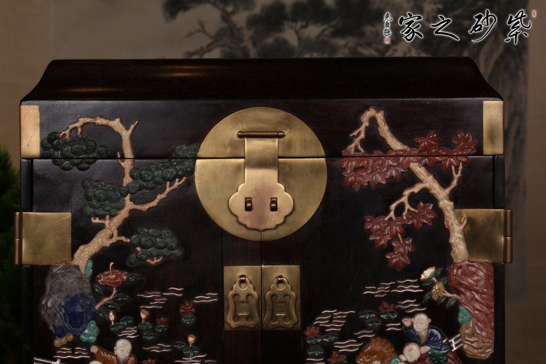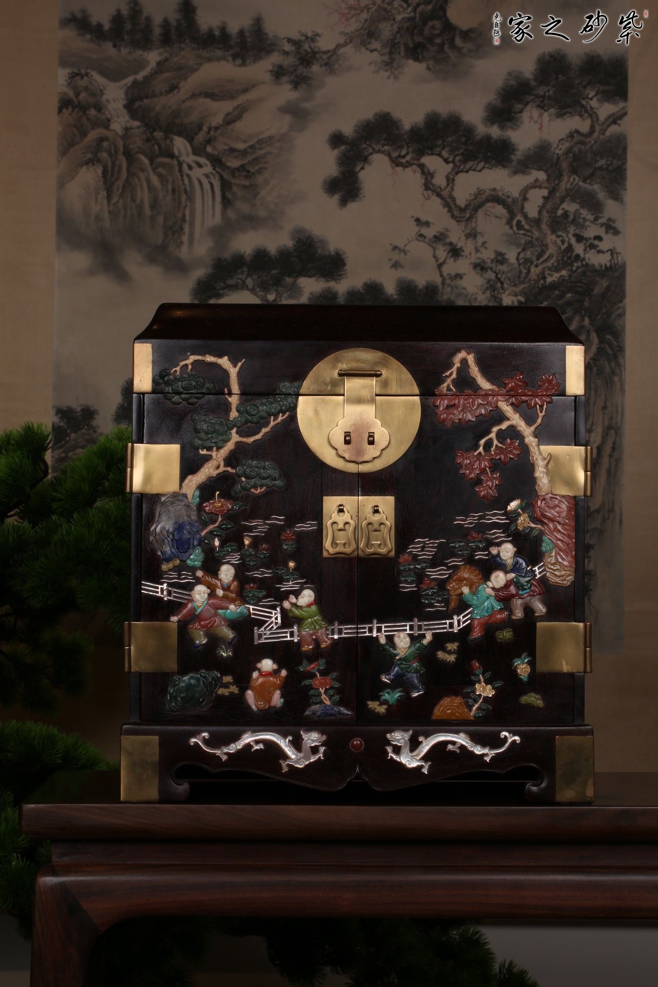 螺钿等珍贵木材和金银等材料嵌入官箱表层,形成童子闹春图案,喜庆非常。