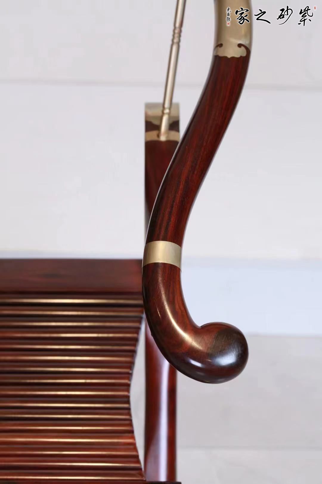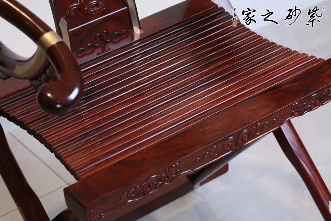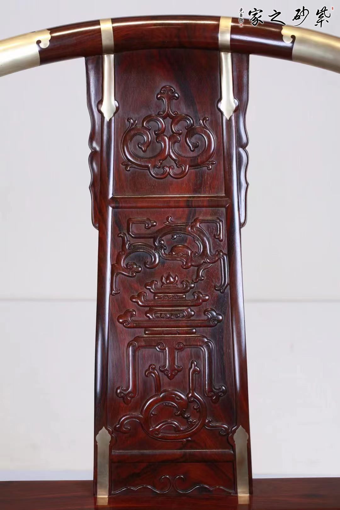 精选上等老挝大红酸枝料制作,色泽沉穆,扶手五接,接处各以黄铜饰件加固,两端出头回转收尾。圈椅靠背板为独板,却刻意仿制为攒靠背式。上端与搭脑正中相接,两侧带曲型窄角牙,上方浮雕寿字龙纹,二龙于祥云间翻腾,神态凶猛威武,形神兼备。