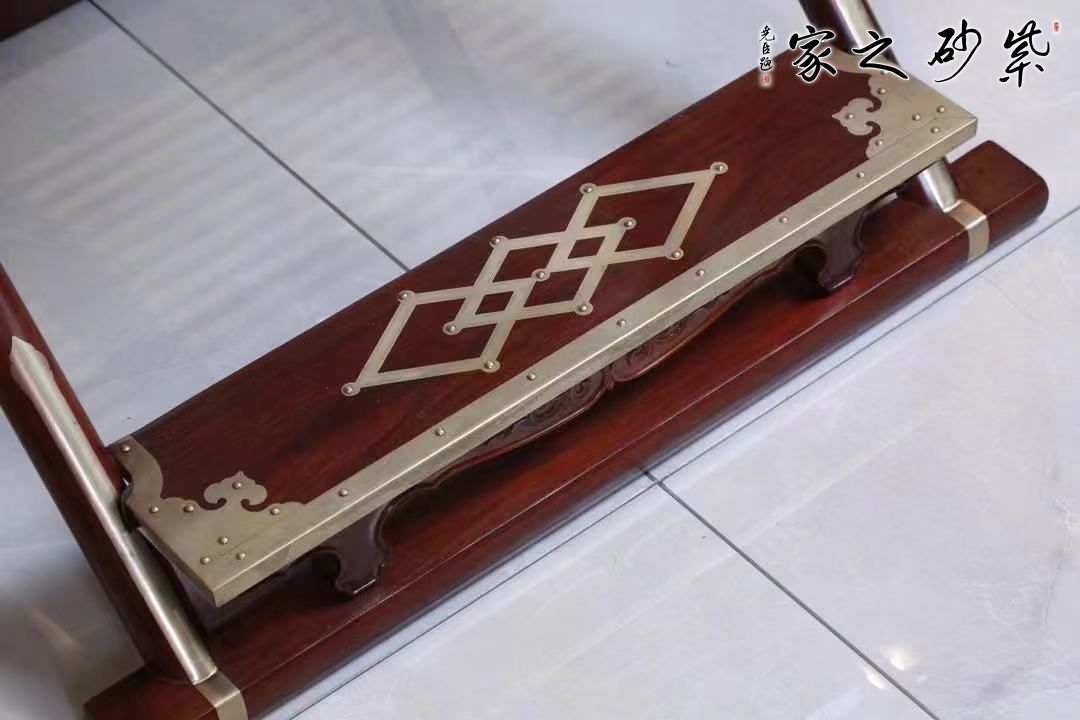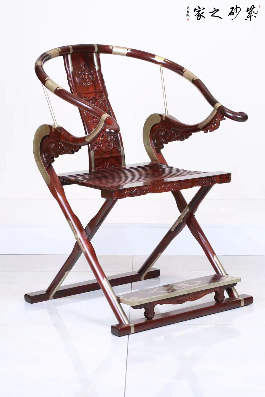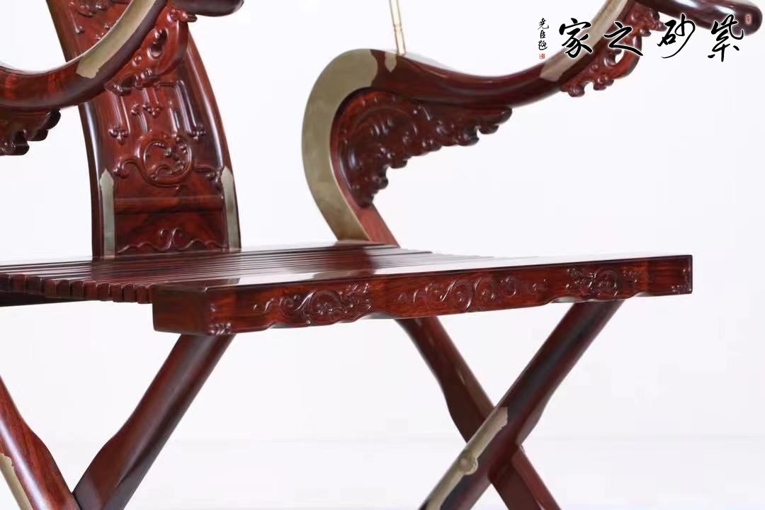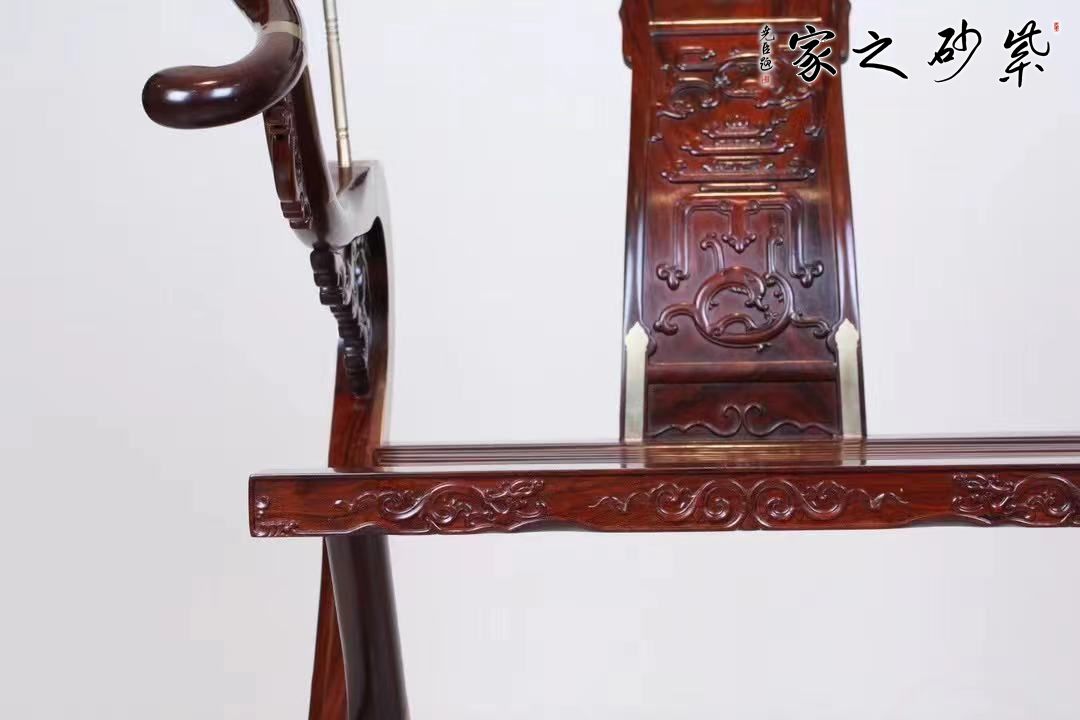 精选上等老挝大红酸枝料制作,色泽沉穆,扶手五接,接处各以黄铜饰件加固,两端出头回转收尾。圈椅靠背板为独板,却刻意仿制为攒靠背式。上端与搭脑正中相接,两侧带曲型窄角牙,上方浮雕寿字龙纹,二龙于祥云间翻腾,神态凶猛威武,形神兼备。